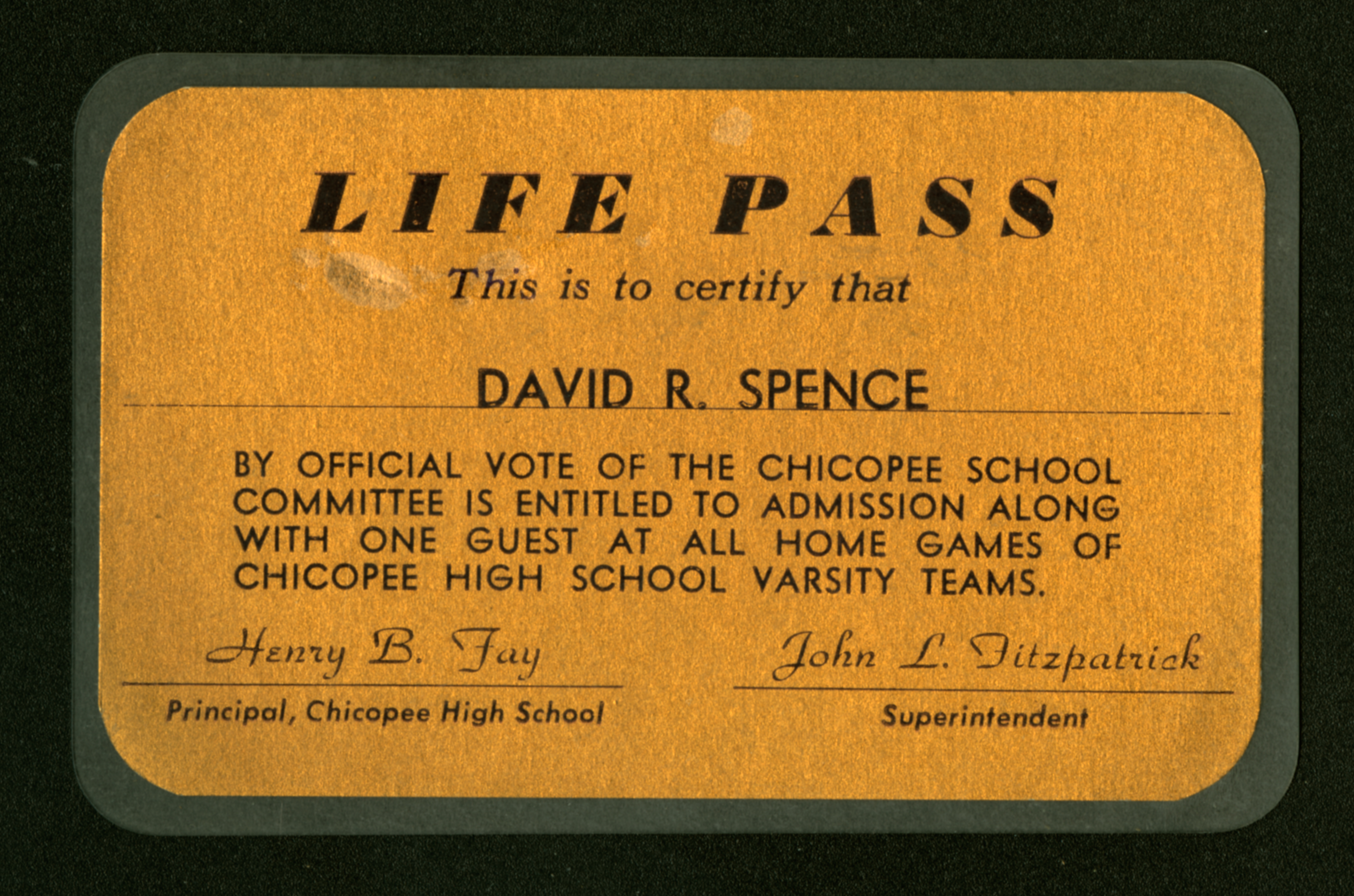 A gold card with black type reading: Life Pass[;] This is to certify that David R. Spence by official vote of the Chicopee School Committee is entitled to admission along with one guest at all home games of Chicopee High School Varsity Teams. [signed by] Henry B. Fay[,] Principal, Chicopee High School[;] John L. Fitzpatrick[,] Superintendant." The card is laminated, and undated.