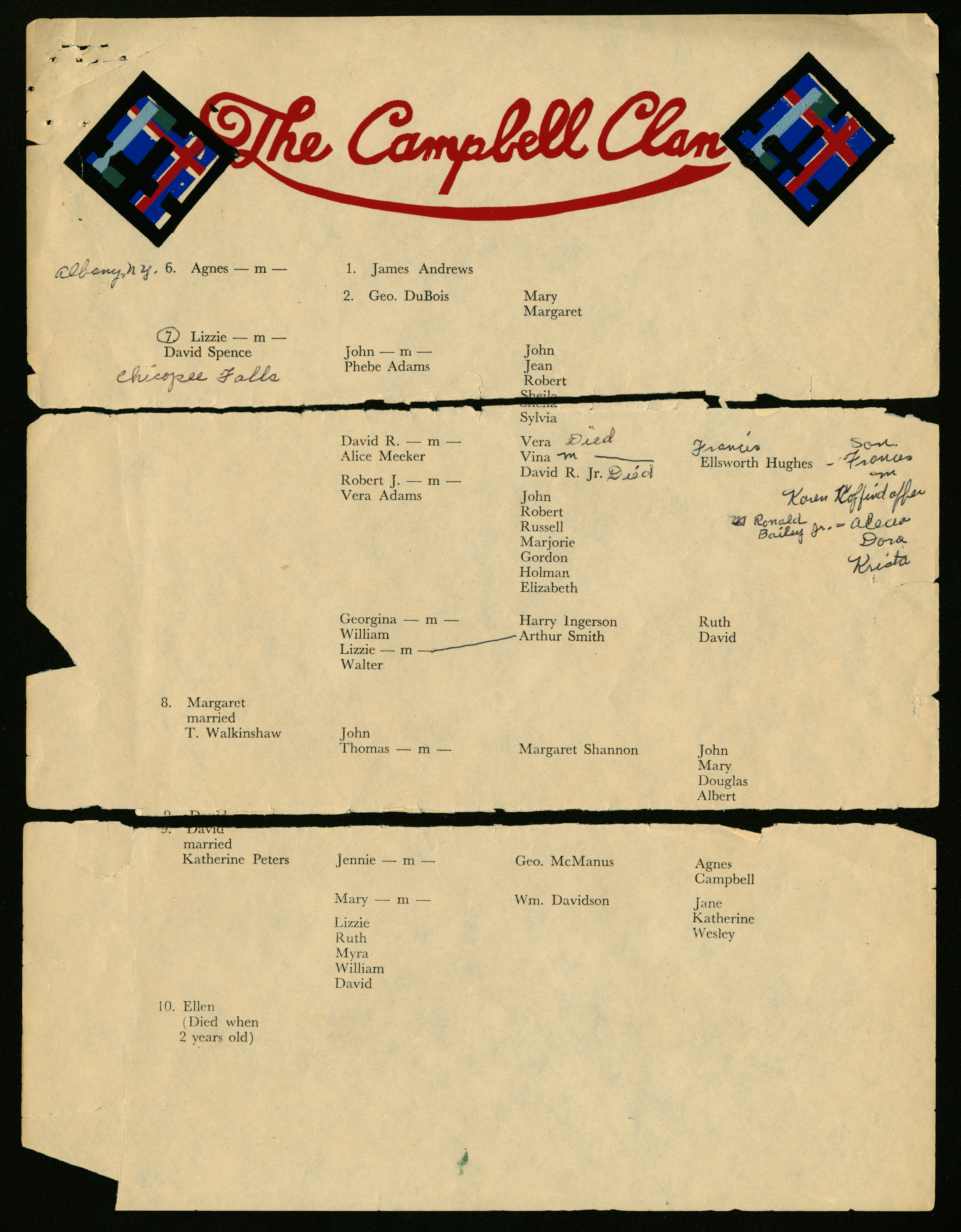 A genealogy labeled "The Campbell Clan," which includes David R. and Vina Spence. The document has hand-painted plaid decorations in the letterhead, and the paper is in such brittle condition that it was fractured along the folds. The second page features annotation, and the two typed pages are accompanied by a handwritten page.