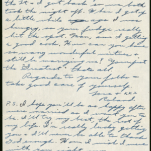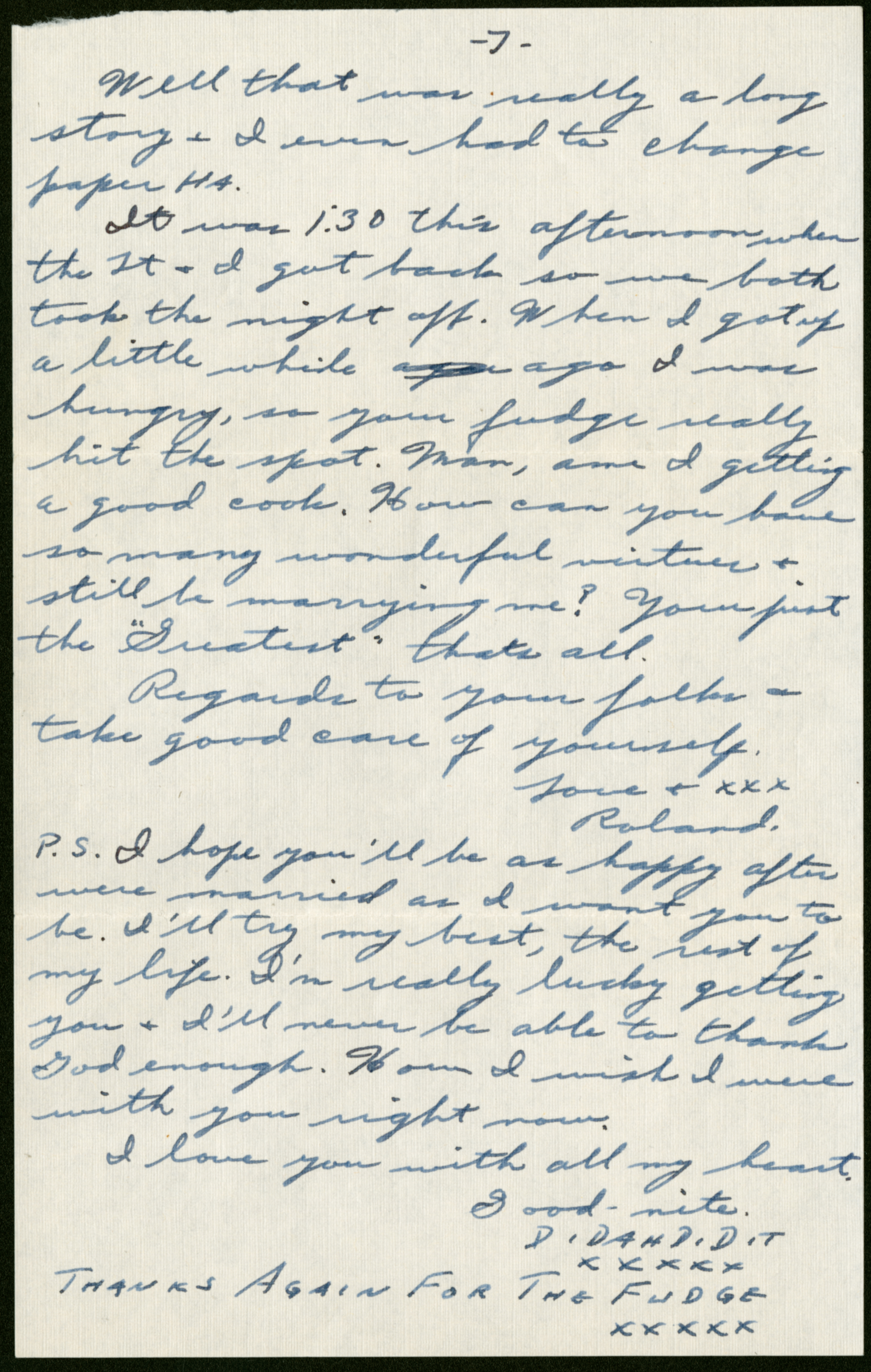 P.S. I hope you’ll be as happy after we’re married as I want you to be. I’ll try my best, the rest of my life. I’m really lucky getting you + I’ll never be able to thank God enough. How I wish I were with you right now.