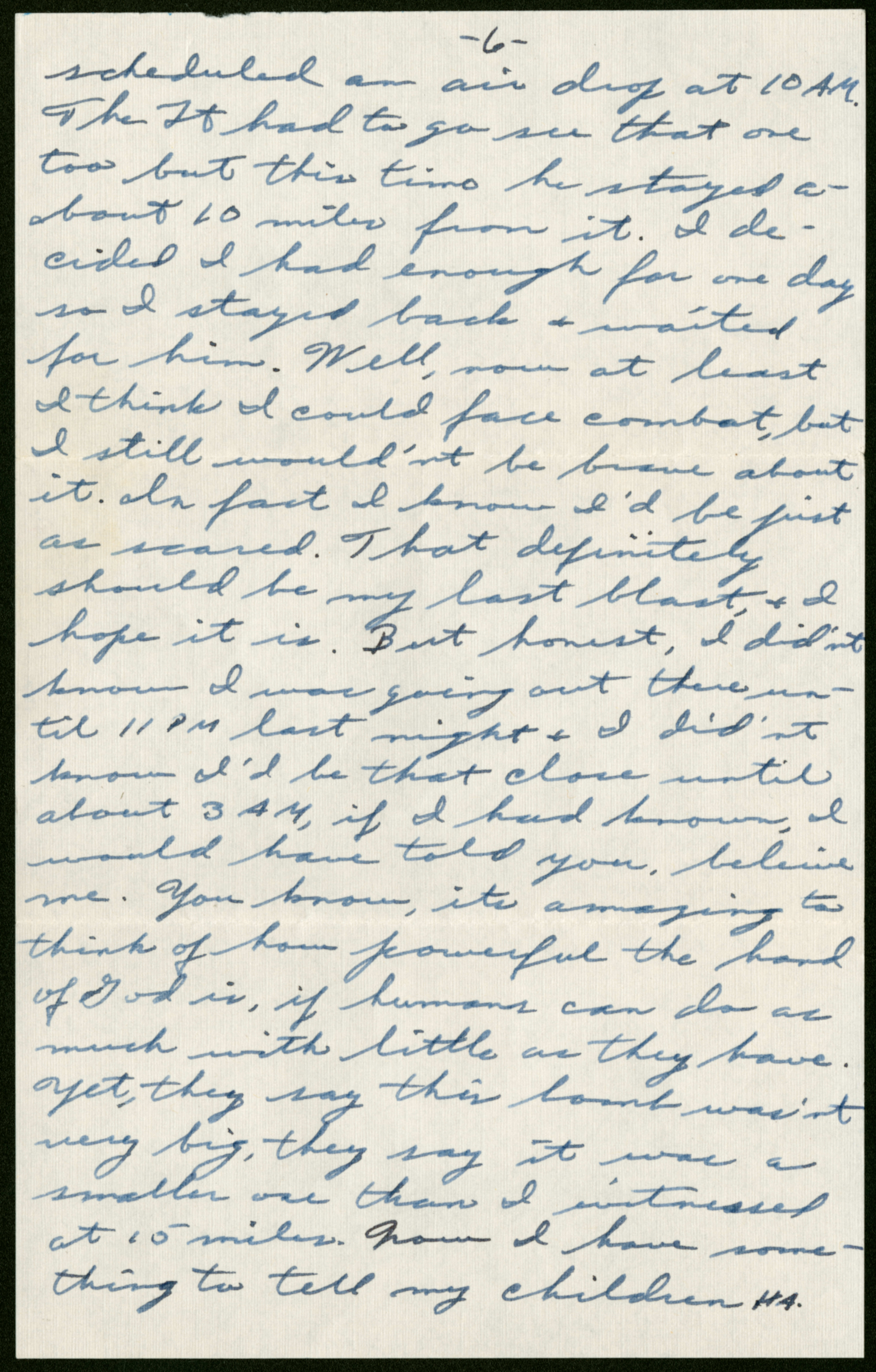 scheduled an air drop at 10 AM. The Lt had to go see that one too but this time he stayed about 10 miles from it. I decided I had enough for one day so I stayed back + waited for him. Well, now at least I think I could face combat, but I still wouldn’t be brave about it. In fact I know I’d be just as scared. That definitely should be my last blast, + I hope it is. But honest, I didn’t know I was going to be out there until 11 PM last night + I didn’t know I’d be that close until about 3 AM, if I had known, I would have told you, believe me. You know, its amazing to think of how powerful the hand of God is, if humans can do as much with as little as they have. Yet, they say this bomb wasn’t very big, they say it was a smaller one than I witnessed at 15 miles. Now I have something to tell my children HA.