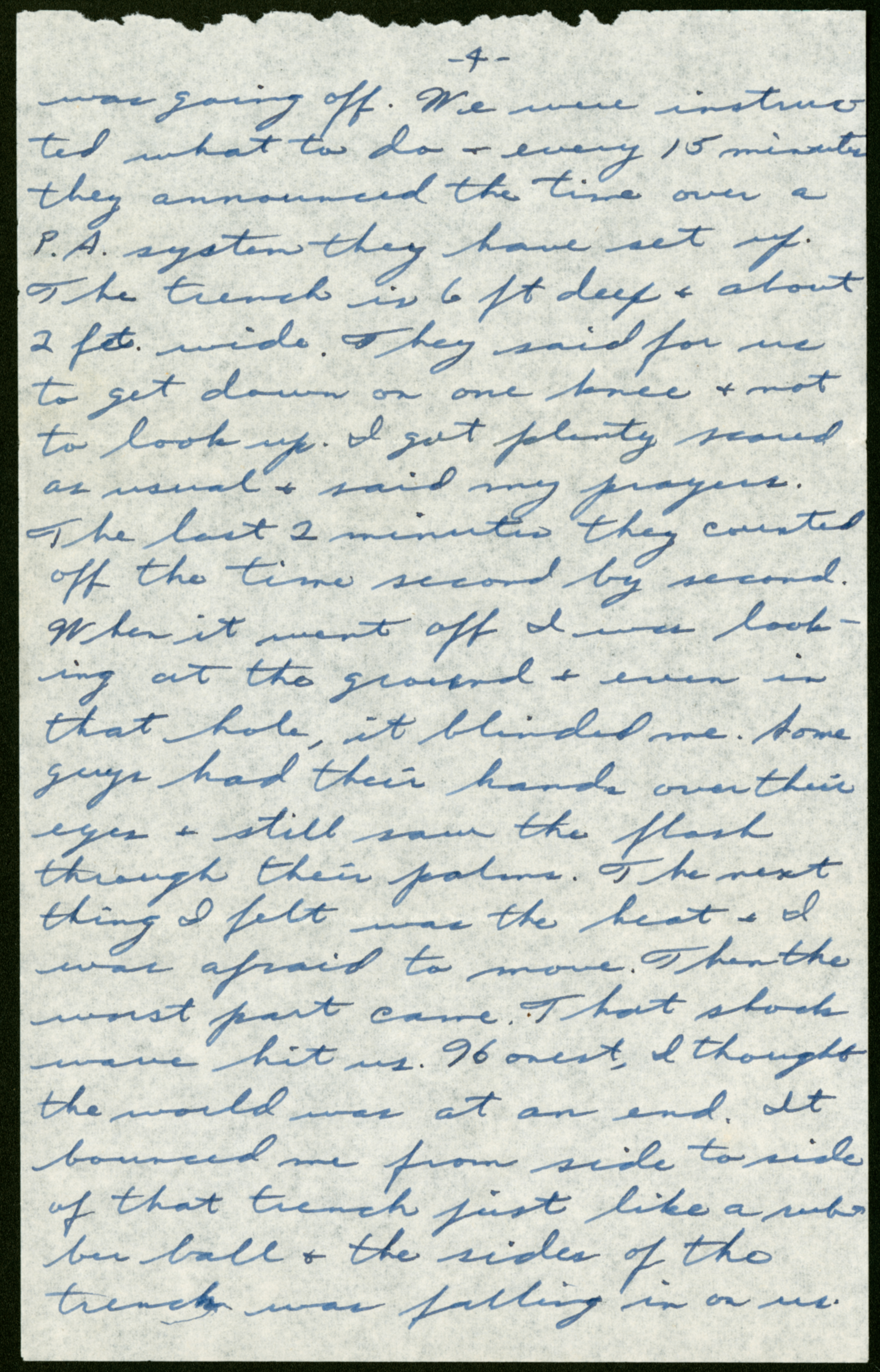was going off. We were instructed what to do + every 15 minutes they announced the time over a P.A. system they have set up. The trench is 6 ft deep + about 2 ft wide. They said for me to get down on one knee + not to look up. I got plenty scared as usual + said my prayers. The last 2 minutes they counted off the time second by second. When it went off I was looking at the ground + even in that hole, it blinded me. Some guys had their hands over their eyes + still saw the flash through their palms. The next thing I felt was the heat + I was afraid to move. Then the worst part came. That shock wave hit us. Honest, I thought the world was at an end. It bounced me from side to side of that trench just like a rubber ball + the side of the trench was falling in on us.
