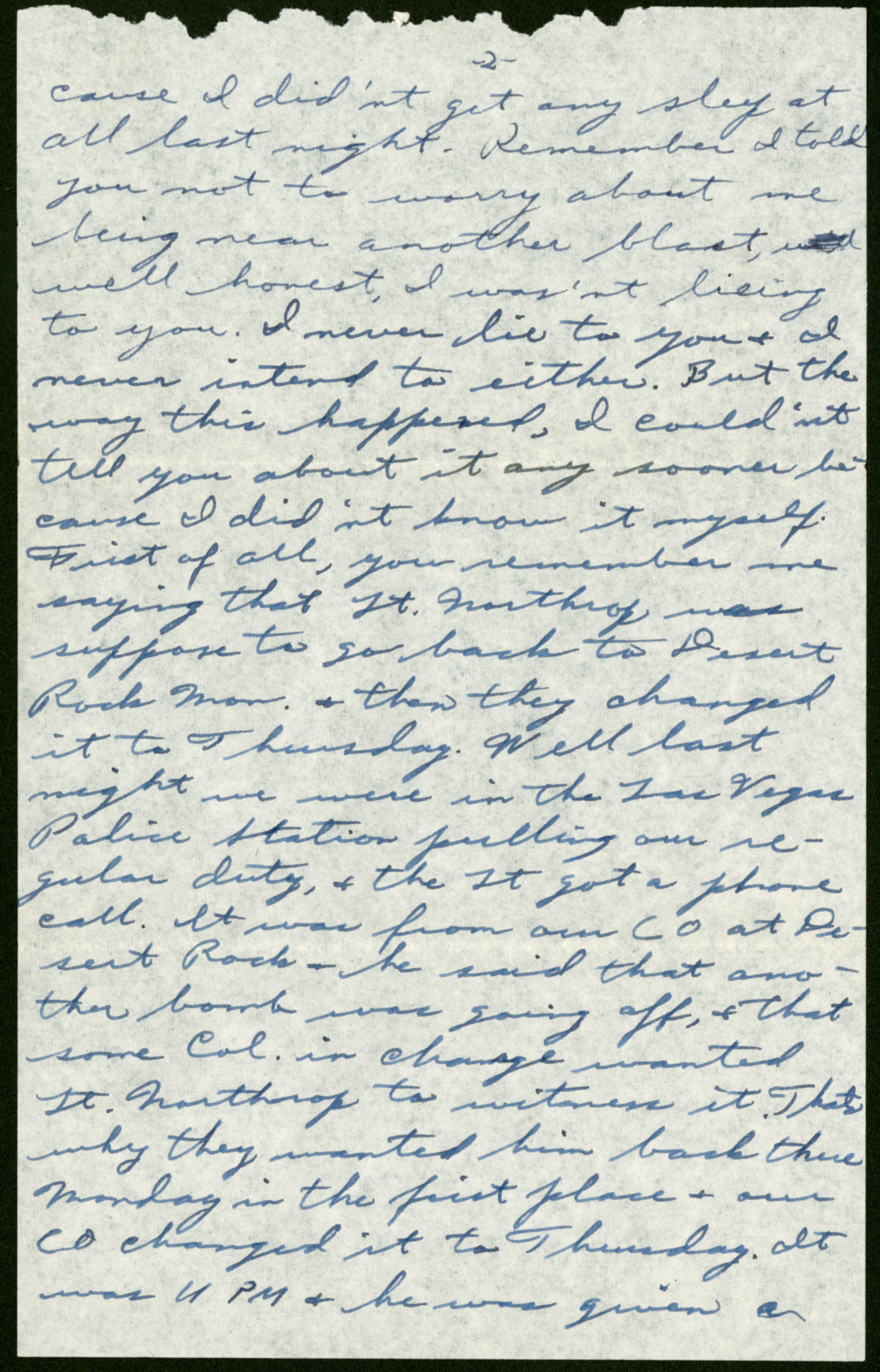 cause I didn’t get any sleep at all last night. Remember I told you not to worry about me being near another blast, well well honest, I wasn’t lieing (sic) to you. I never lie to you + I never intend to either. But the way this happened, I couldn’t tell you about it any sooner because I didn’t know it myself. First of all, you remember me saying that Lt. Northrop was suppose (sic) to go back to Desert Rock Mon. + then they changed it to Thursday. Well last night we were in the Las Vegas Police Station pulling our regular duty, + the Lt got a phone call. It was from our CO at Desert Rock + he said that another bomb was going off, + that some Col. in charge wanted Lt. Northrop to witness it. That’s why they wanted him back there Monday in the first place + our CO changed it to Thursday. It was 11 PM + he was given a