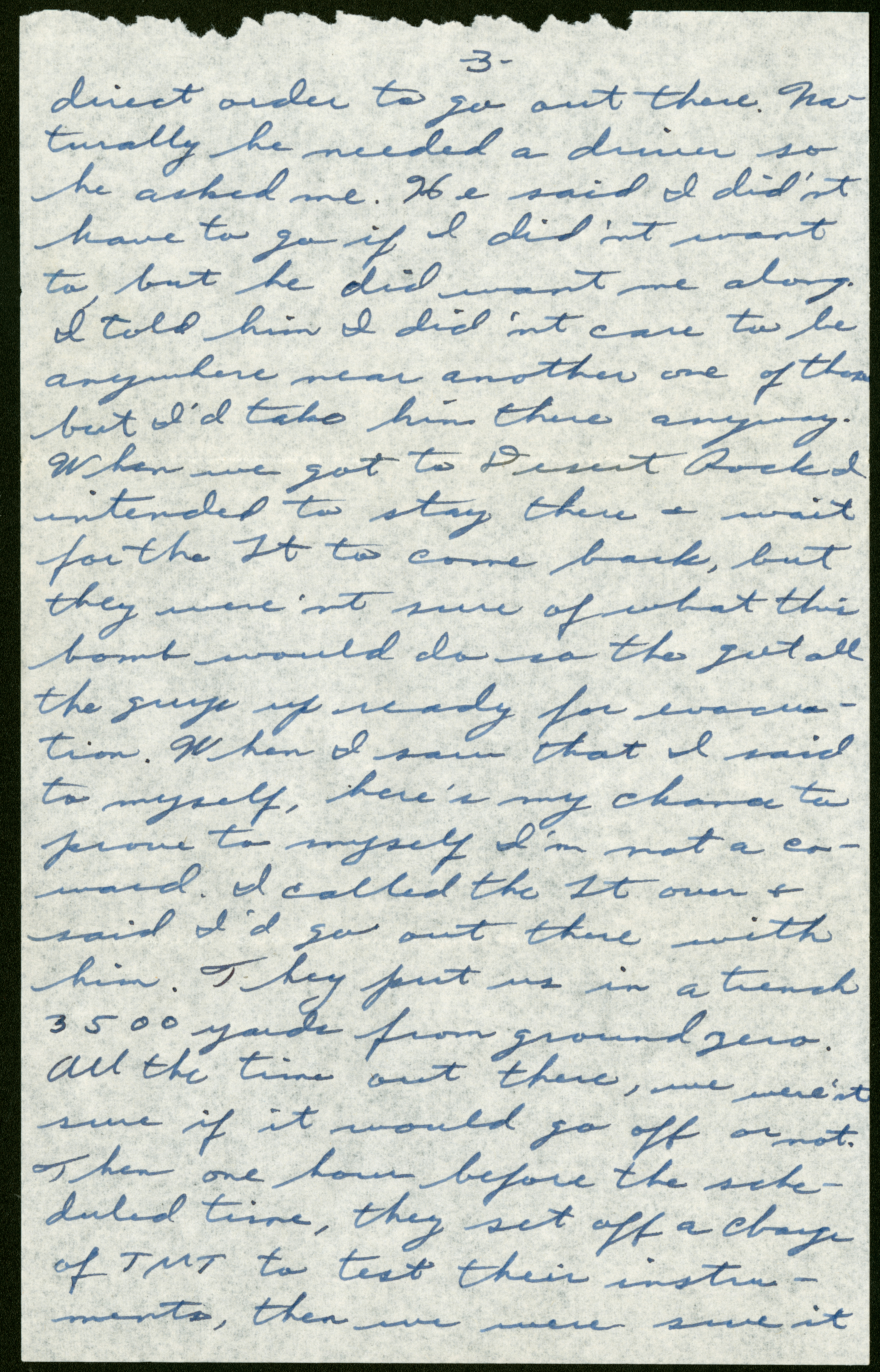 direct order to go out there. Normally he needed a driver so he asked me. He said I didn’t have to go if I didn’t want to, but he did want me along. I told him I didn’t care to be anywhere near another one of them but I’d take him there anyway. When we got to Desert Rock I intended to stay there + wait for the Lt to come back, but they weren’t sure of what this bomb would do so the [sic] got all the guys up ready for evacuation. When I saw that I said to myself, here’s my chance to prove to myself I’m not a coward. I called the Lt over + said I’d go out there with him. They put us in a trench 3500 yards from ground zero. All the time out there, we weren’t sure if it would go off or not. Then one hour before the scheduled time, they set off a charge of TNT to test their instruments, then we were sure it