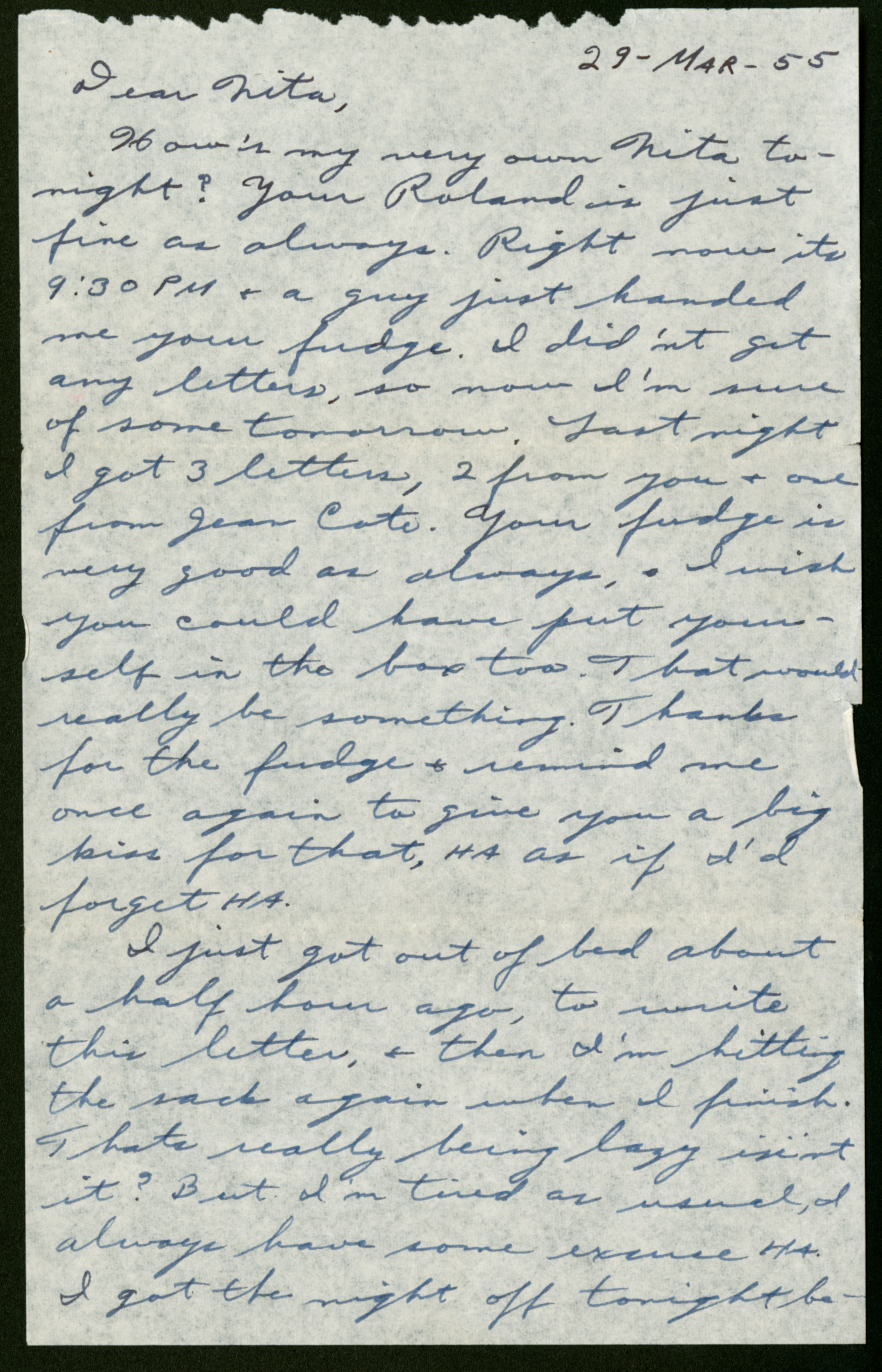 How’s my very own Nita tonight? Your Roland is just fine as always. Right now it’s 9:30 PM + a guy just handed me your fudge. I didn’t get any letters, so now I’m sure of some tomorrow. Last night I got 3 letters, 2 from you + one from Jean Cote. Your fudge is very good as always, I wish you could have put yourself in the box too. That would really be something. Thanks for the fudge + remind me once again to give you a big kiss for that, HA as if I’d forget HA.