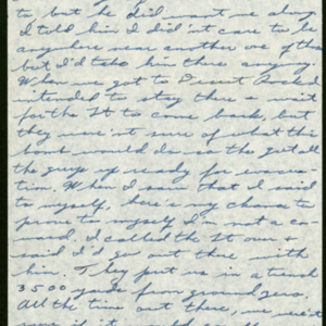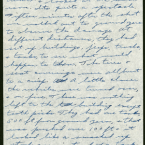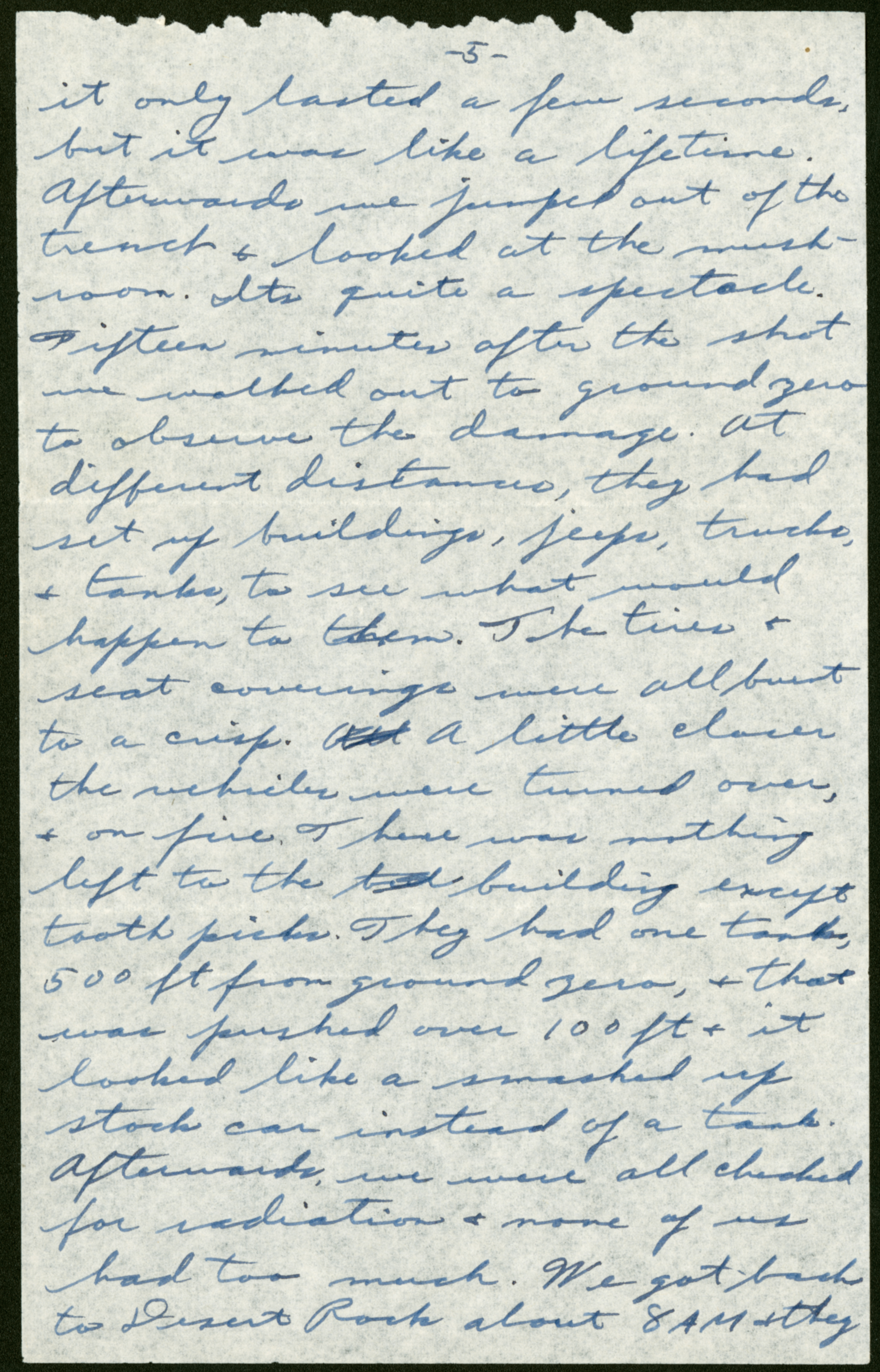 It only lasted a few seconds, but it was like a lifetime. Afterwards we jumped out of the trench + looked at the mushroom. Its quite a spectacle. Fifteen minutes after the shot we walked out to ground zero to observe the damage. At different distances, they had set up buildings, jeeps, trucks, + tanks, to see what would happen to them. The tires + seat coverings were all burnt to a crisp. A little closer the vehicles were turned over, + on fire. There was nothing left to the building except tooth picks. They had one tank, 500 ft from ground zero, + that was pushed over 100 ft + it looked like a smashed up stock can instead of a tank. Afterwards, we were all checked for radiation + none of us had too much. We got back to Desert Rock about 8 AM + they