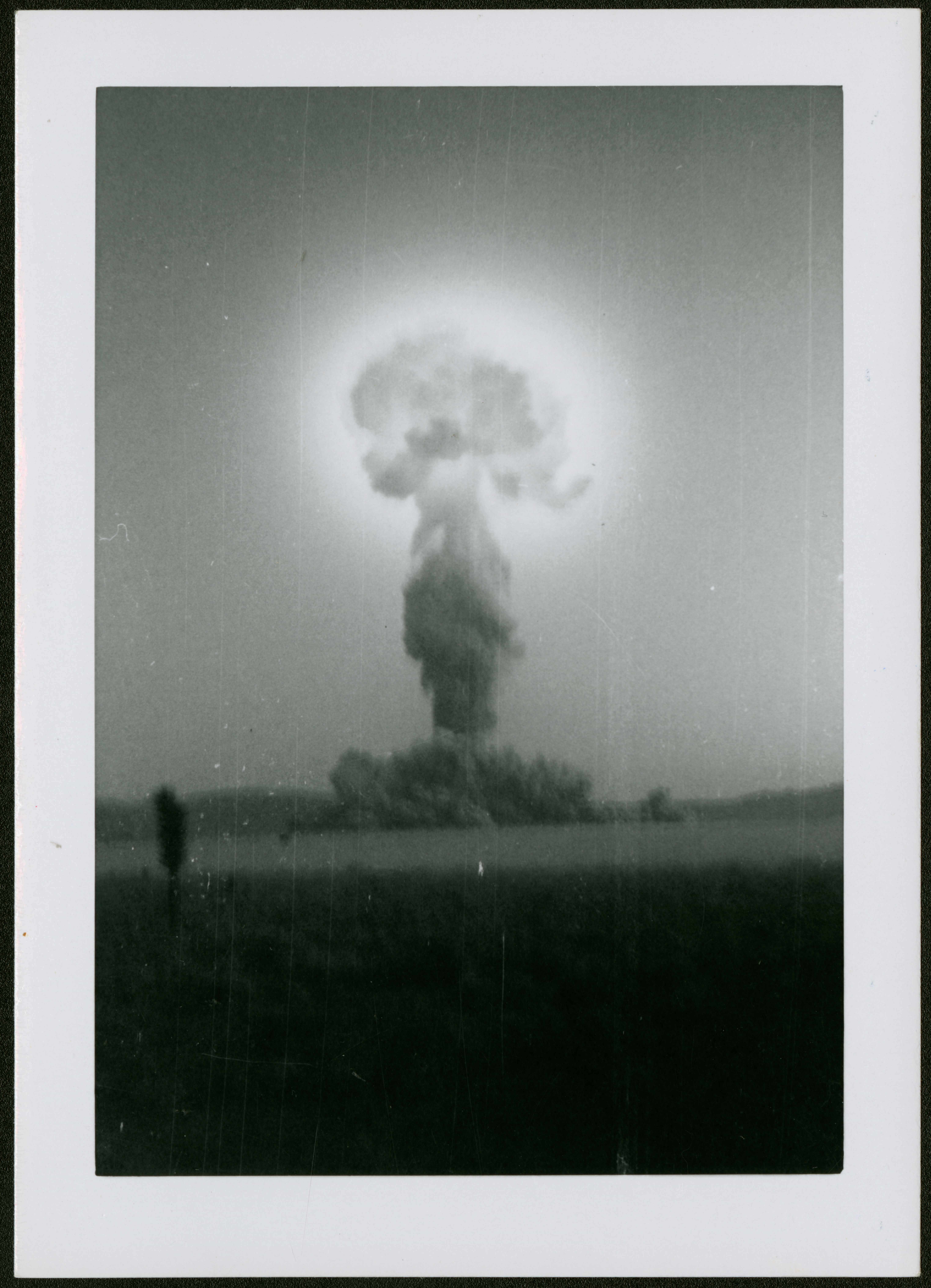 A black and white photograph of a glowing mushroom cloud. Part of Operation Teapot in 1955, this was one of the tests of the atomic bomb in 1955 witnessed by Chicopee resident Roland Pronovost during his service at the Nevada National Security Site.