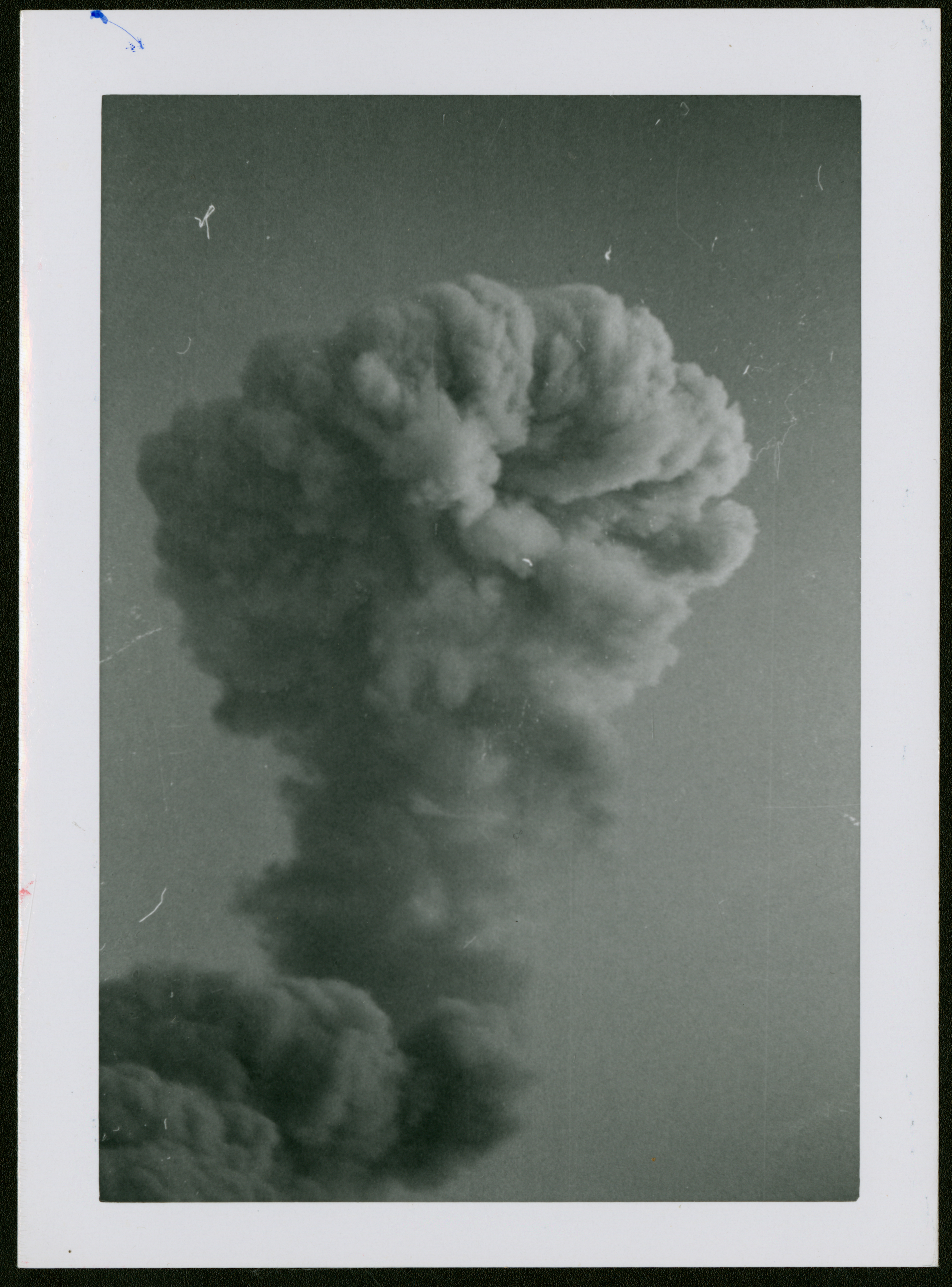 A black and white photograph of a mushroom cloud. Part of Operation Teapot in 1955, this was one of the tests of the atomic bomb in 1955 witnessed by Chicopee resident Roland Pronovost during his service at the Nevada National Security Site.