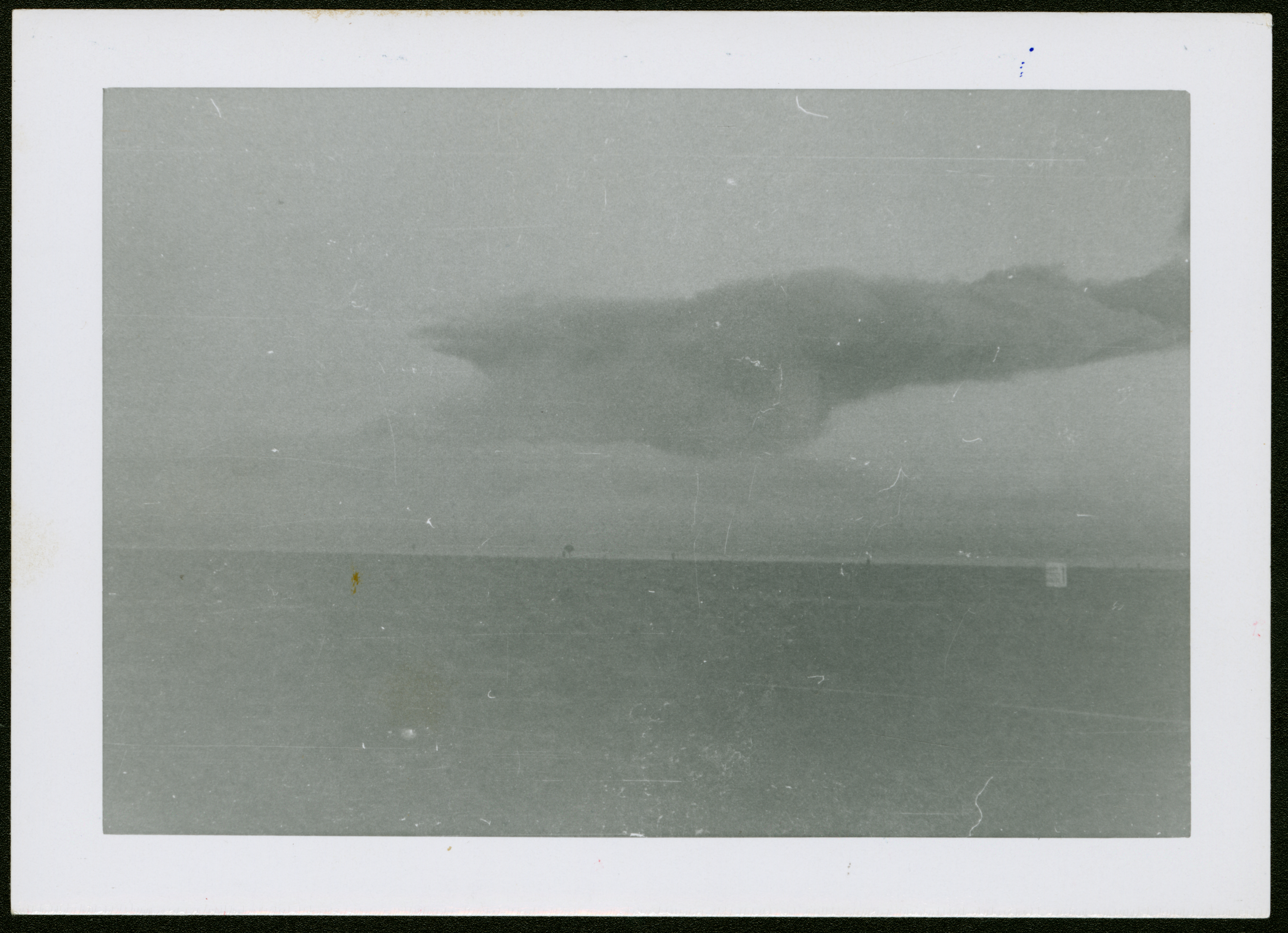 A black and white photograph of a mostly-dissipated mushroom cloud. Part of Operation Teapot in 1955, this was one of the tests of the atomic bomb in 1955 witnessed by Chicopee resident Roland Pronovost during his service at the Nevada National Security Site.