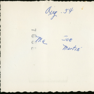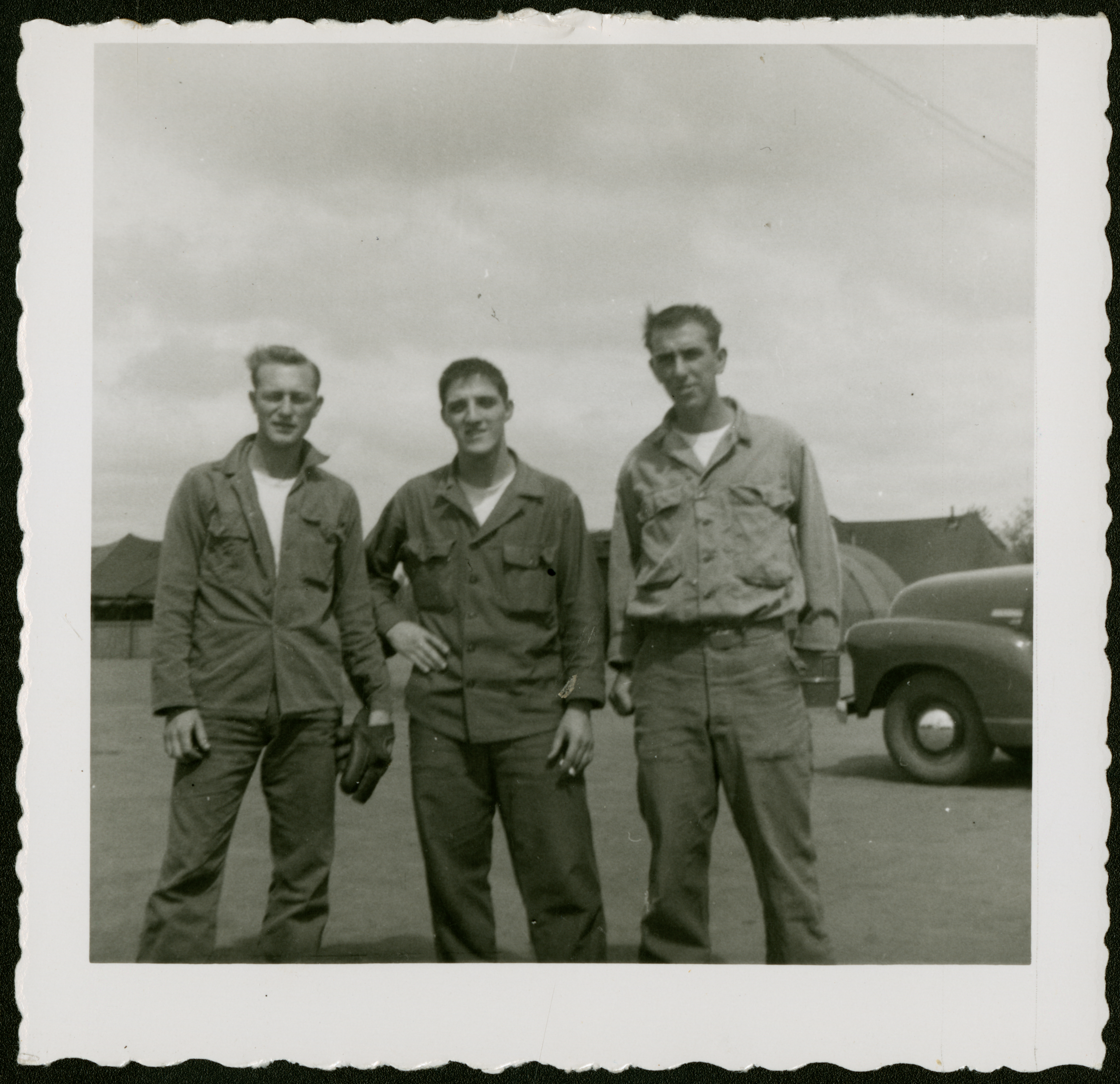 A black and white image of three men standing outside near a vehicle, with tents and buildings in the background. The man on the left is wearing a baseball mitt; the man in the middle has a cigarette in his left hand; and the man on the right has one hand in his pocket. All three are wearing "casual" uniform and looking more or less at the camera. The back of the photo reads "Aug. 54; Me; Joe Martin." While it is not clear from the label who's who, the man in the middle was identified by his son as Roland Pronovost, suggesting the man on the left is Joe Martin. The third man is not identified.
