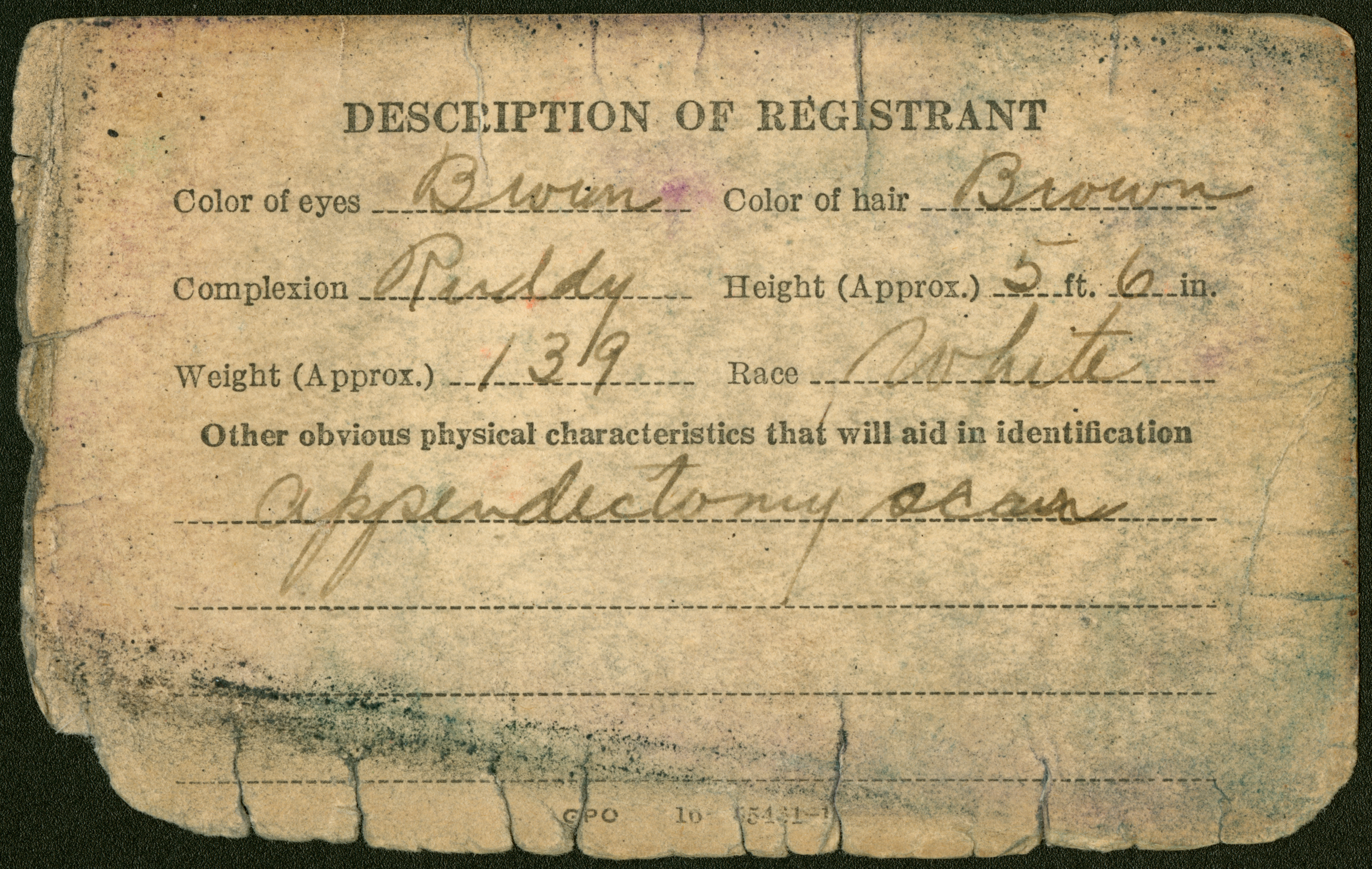 A battered Selective Service System Registration Certificate for Roland Pronovost, dated September 17, 1948. Though aged and quite damaged around the edges, the information written in is still clearly visible, and provides his personal information and a generic description of him at the time of his draft registration, as well as his signature.