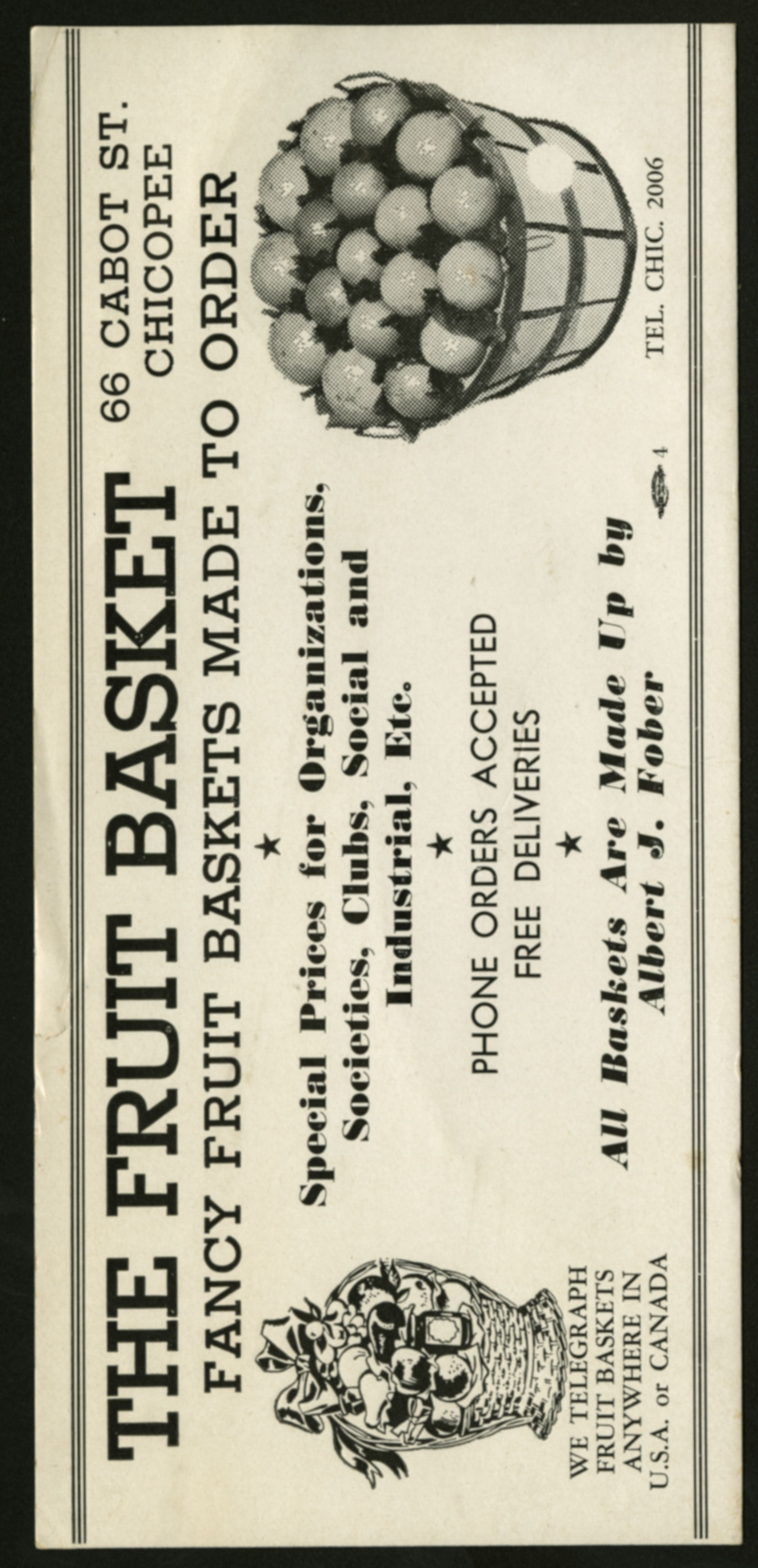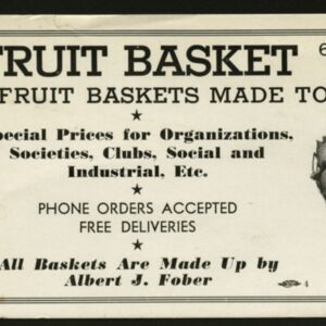 A sponsorship ticket that advertises "The Fruit Basket" a ticket made to promote fancy fruit baskets to order from Albert J. Fober. Located on 66 Cabot Street in Chicopee, Massachussettes. Stamped by the Allied Printers Trades Union Label Council; (Undated)