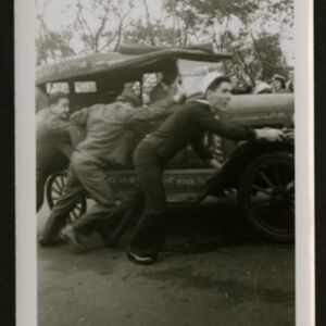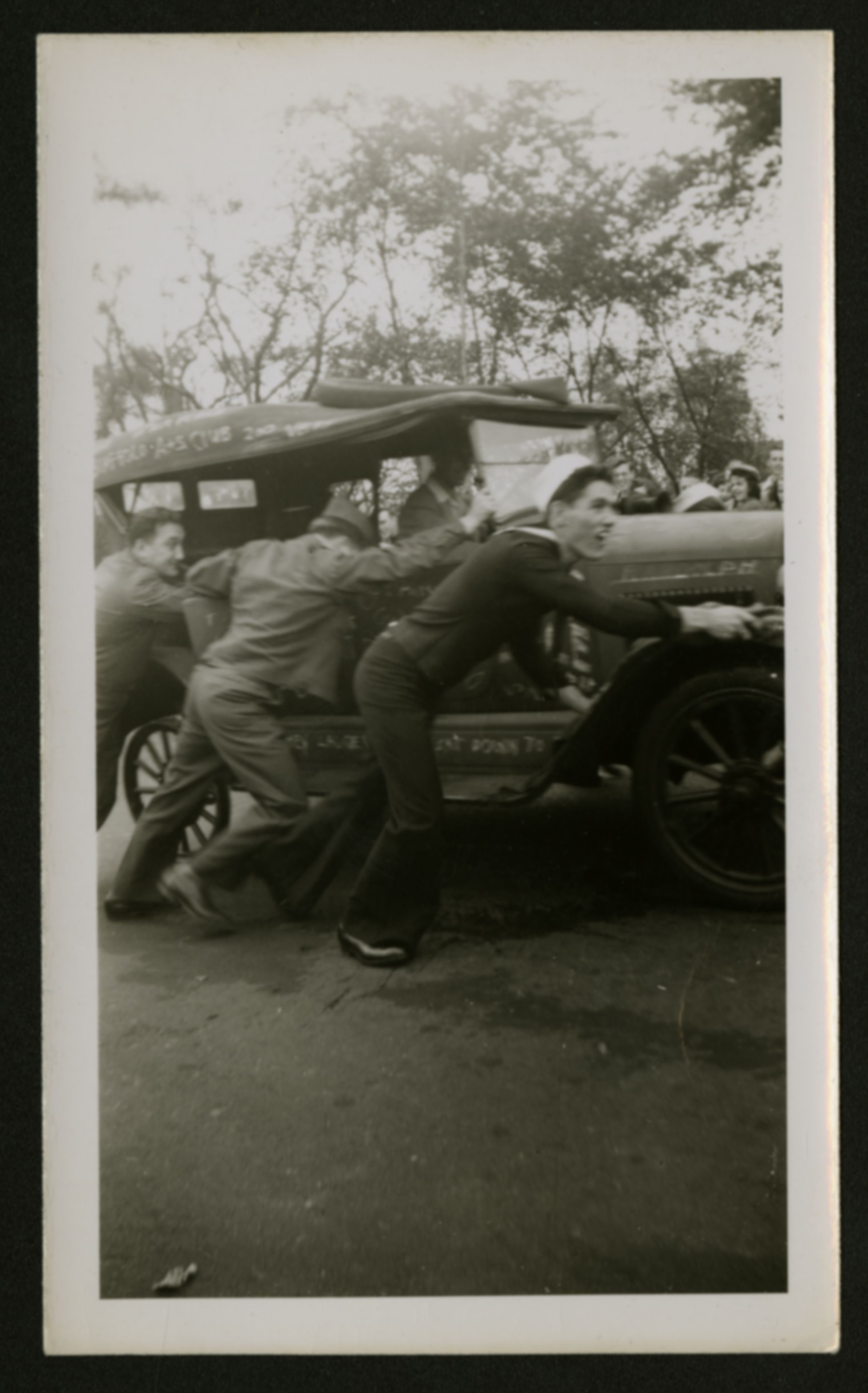 A photograph of returning soldiers pushing a vehicle upwards with four people being visible and pushing the car, and a person sitting in the passenger seat; (Undated)