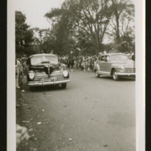 A photograph showing two vintage cars being driven down the road and accompanied by mounted police officers; (Undated)