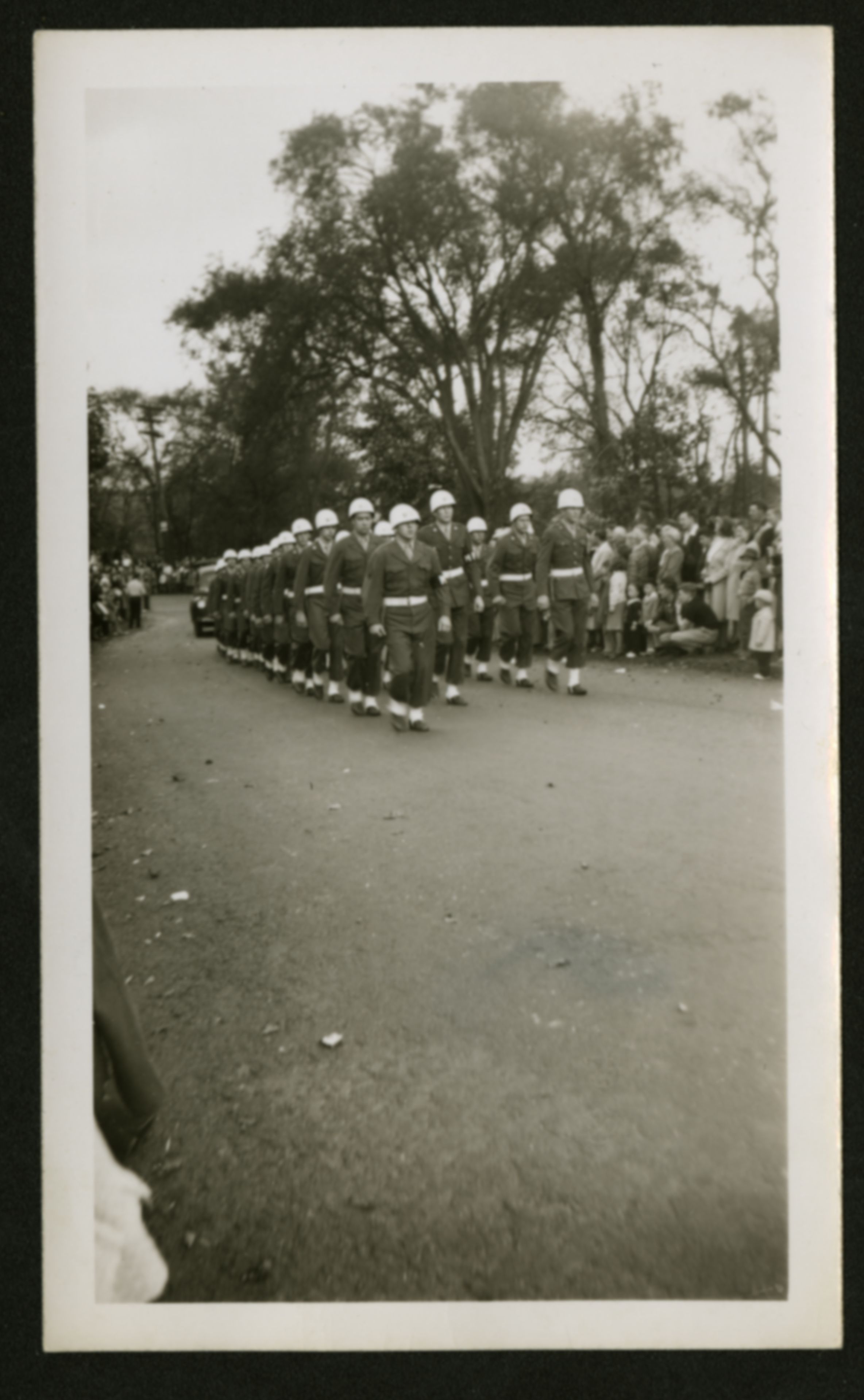 A photograph showing a line of a marching military regiment all wearing white helmets; (Undated)