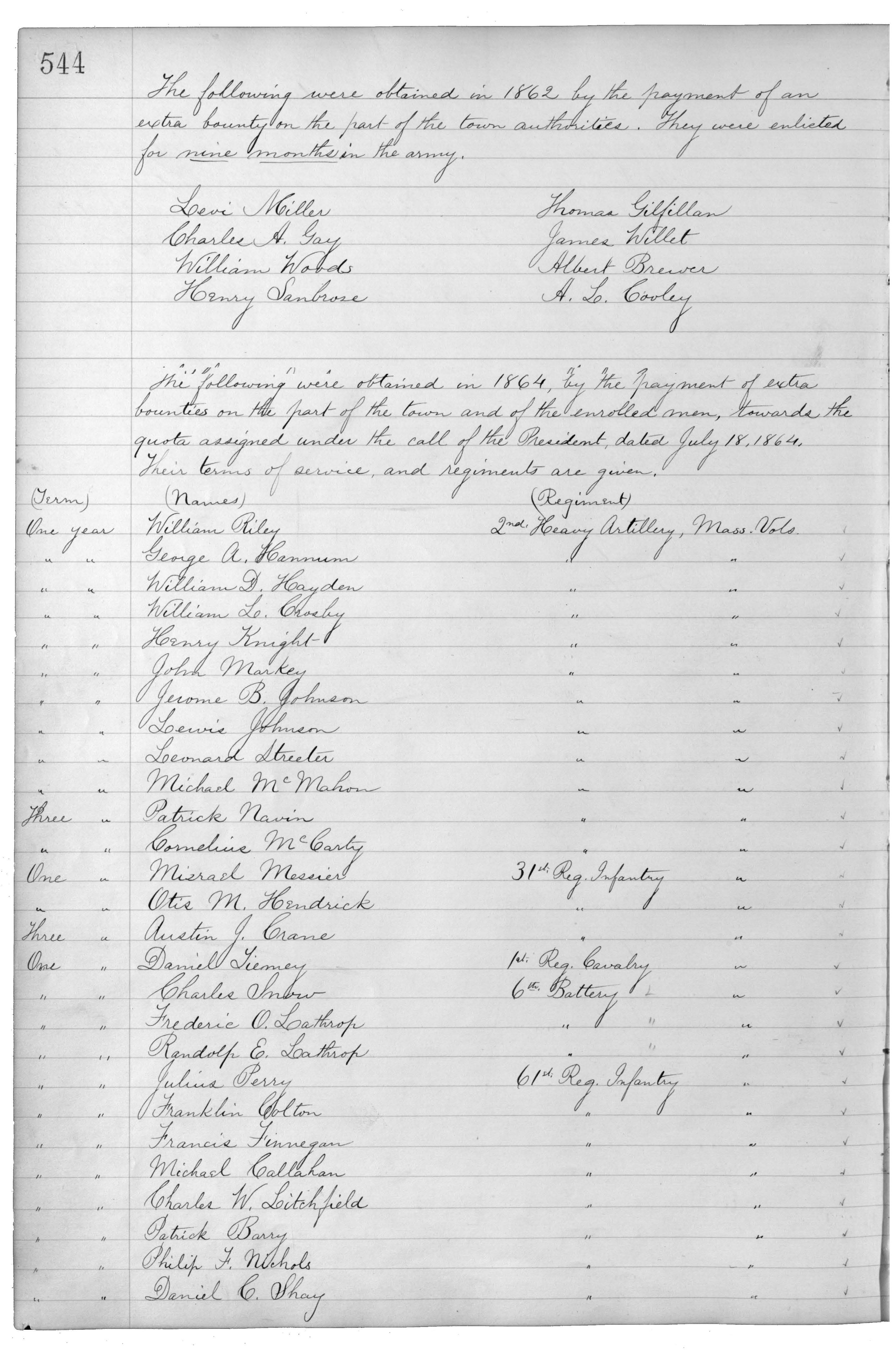 The following were obtained in 1862 by the payment of an extra bounty on the part of the town authorities. They were enlisted for nine months in the army.