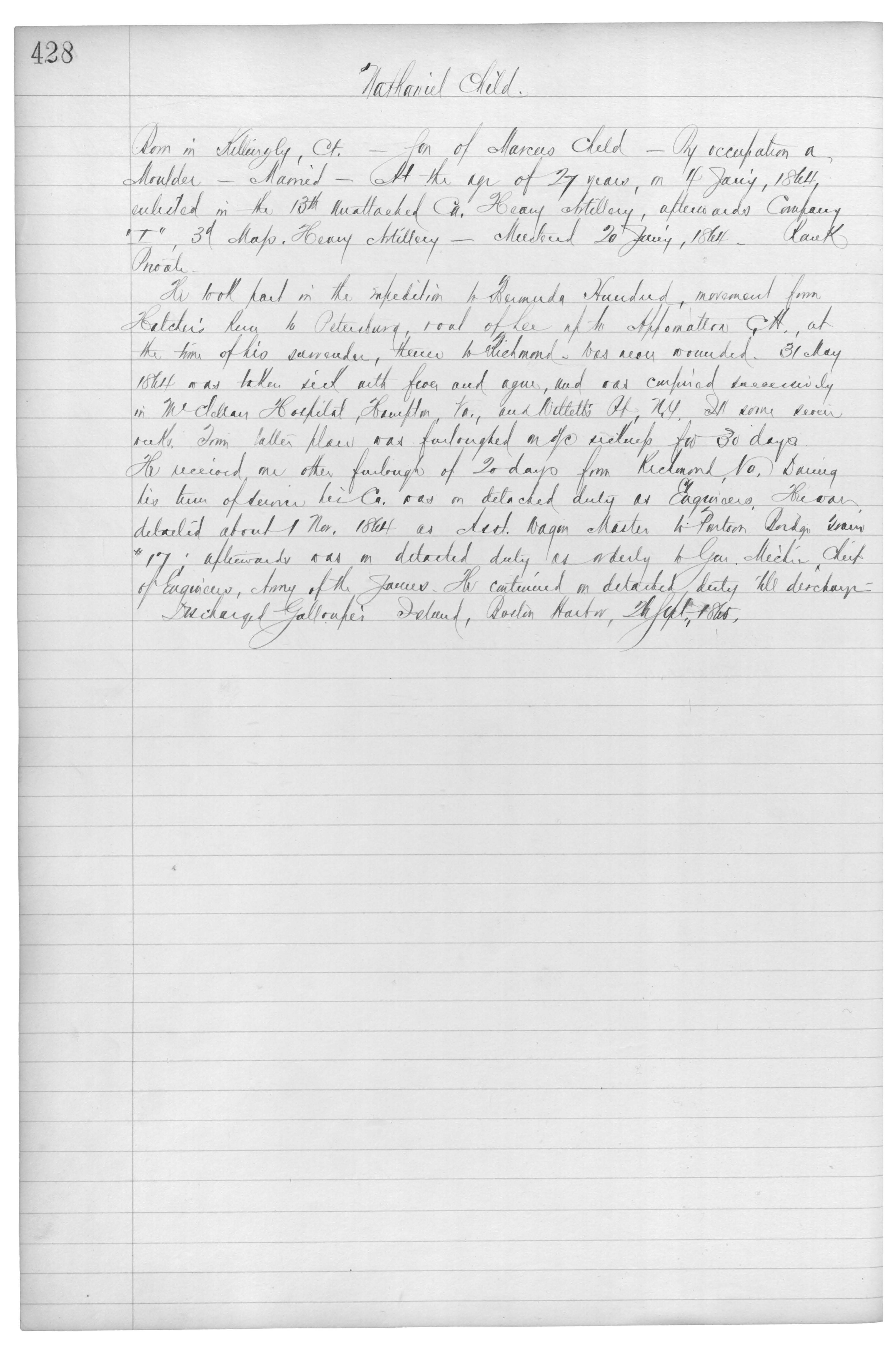 He took part in the expedition to Bermuda Hundred, movement from Hatcher’s Run to Petersburgh, {???} of her up to Appomattox Ct., at the time of his surrender, thence to Richmond_was never wounded. 31 May 1864 was taken sick with fever and ague, and was confined successively in McClellan Hospital, Hampton, Va., and {Millell’s Pt}, N.Y. Ill some seven weeks. {From} latter place was furloughed on {???} sickness for 30 days. He received one other furlough of 20 days from Richmond, Va. During his term of service his Co. was on detached duty as Engineers. He was detailed about 1 Nov. 1864 as Asst. Wagon Master to Pontoon Bridge Train #17; afterwards was on detached duty as orderly to Gen. {Michie}, chief of Engineers, Army of the James. He continue on detached duty till discharge.