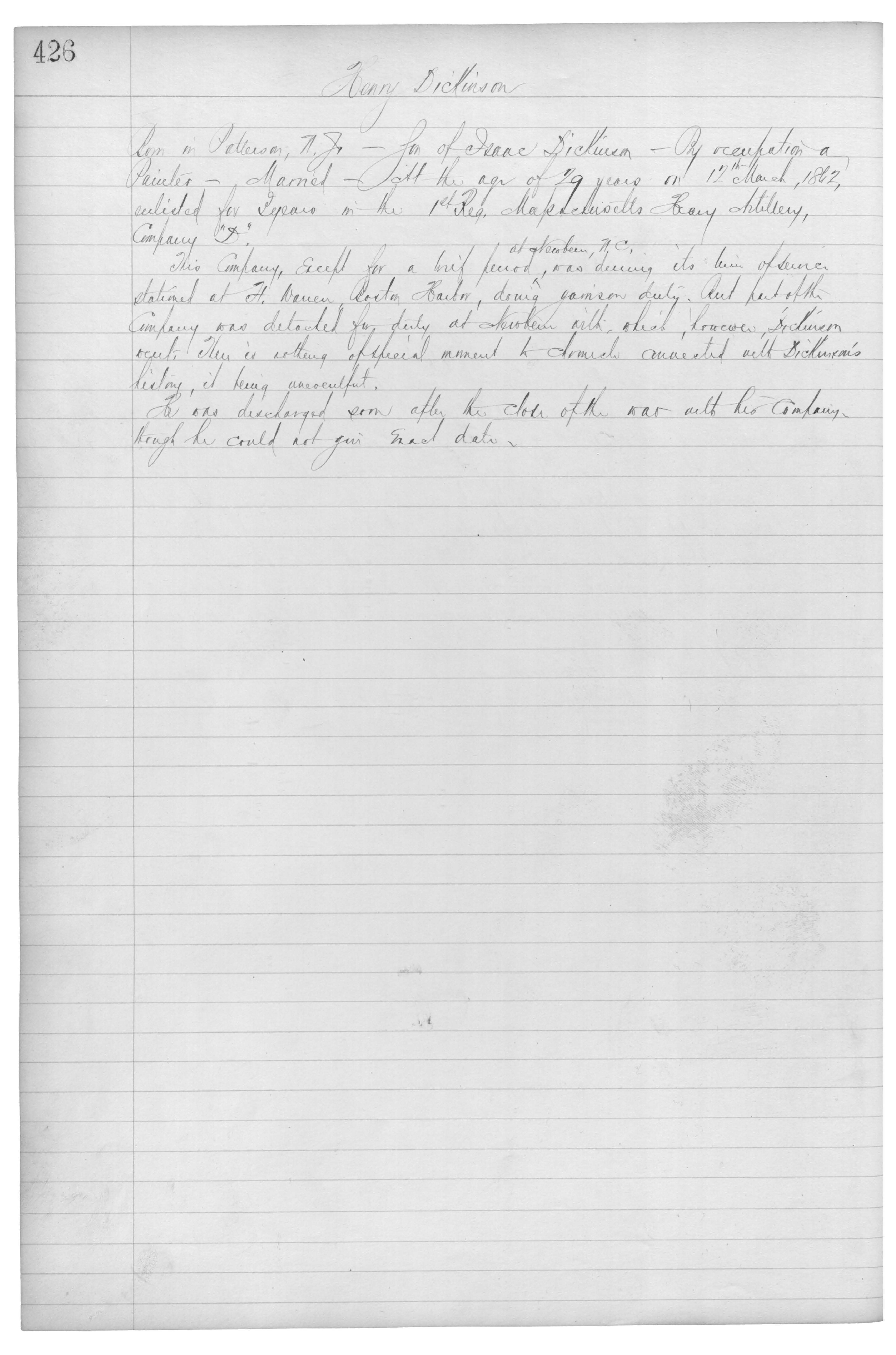 Born in Patterson, N.J._Son of Isaac Dickinson_by occupation a Painter_Married_At the age of 29 years on 12th March, 1862, enlisted for 3 years in the 1st Reg. Massachusetts Heavy Artillery, Company “D”.
