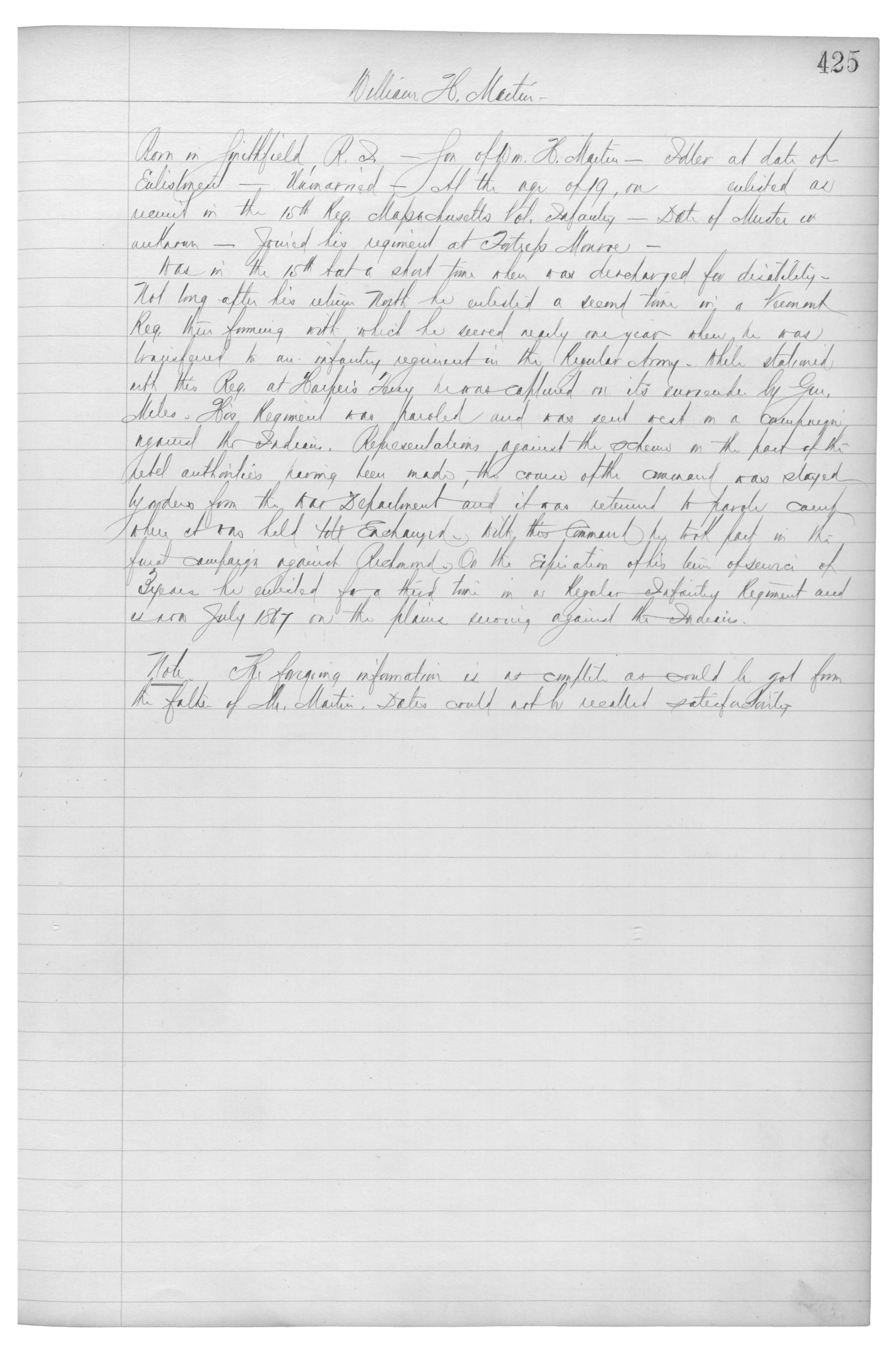 Born in Smithfield, R.I._Son of Wm. H. Martin_Idler at date of enlistement_Unmarried_At the age of 19, on enlisted as recruit in the 15th Reg. Massachusetts Vol. Infantry_Date of Muster is unknown_Joined his regiment at Fortress Monroe_