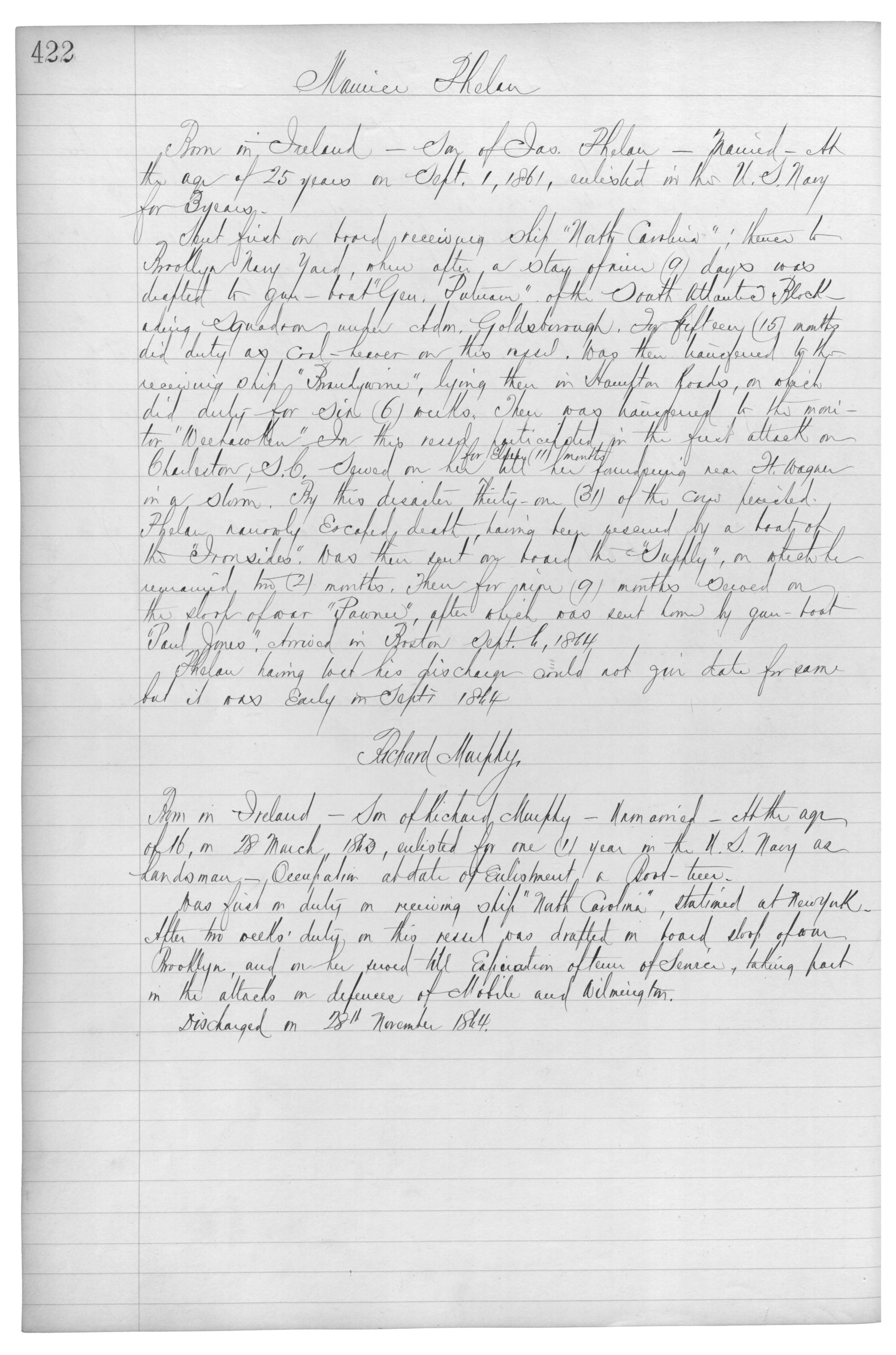 Born in Ireland_Son of Richard Murphy_Unmarried_At the age of 16, on 28 March, {1863}, enlisted for one (1) year in the U.S Navy as Landsman_{Occupation} at date of Enlsited a {Board-Treer}