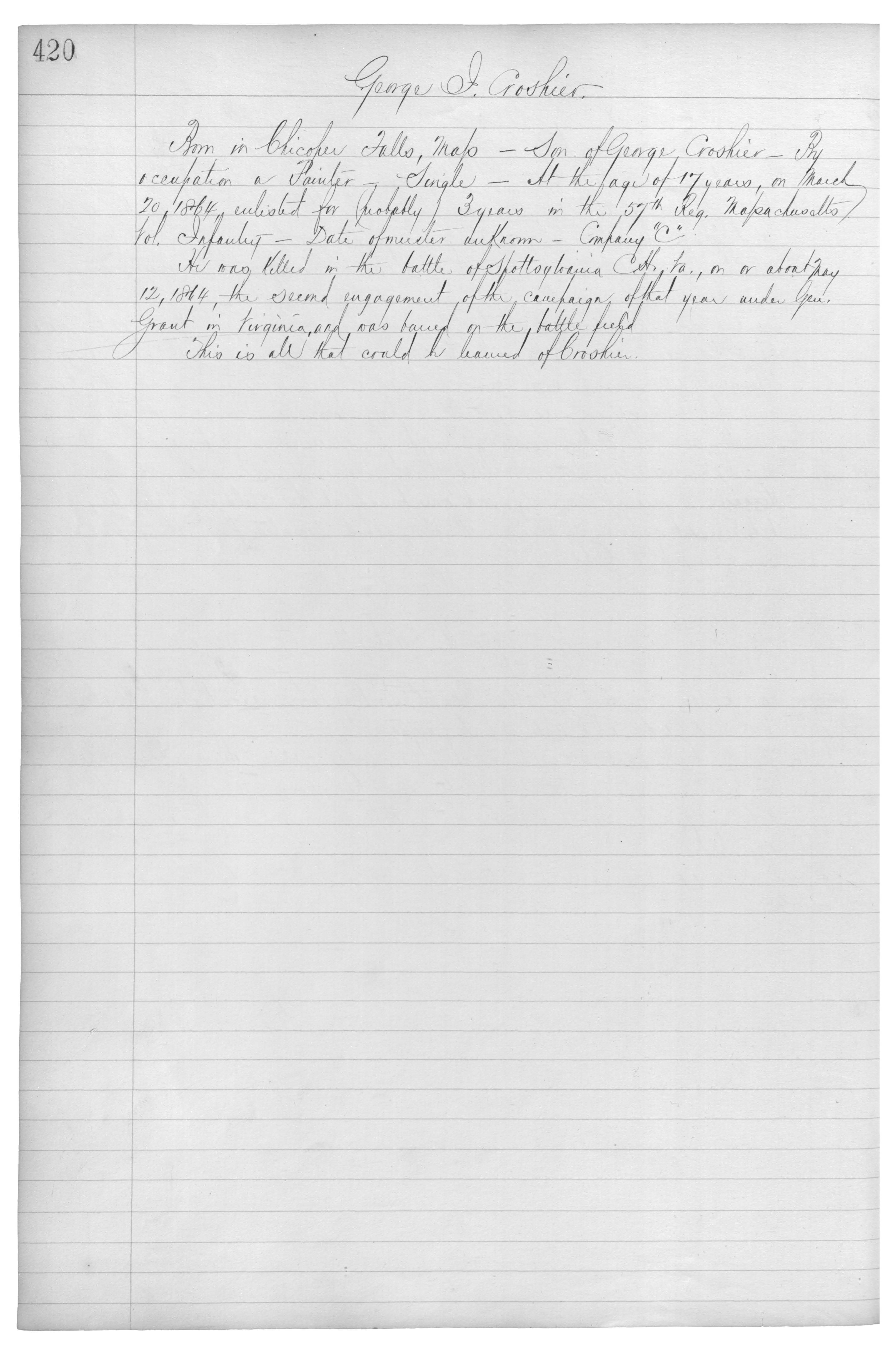Born in Chicopee Falls, Mass_Son of George Croshier_By occupation a Painter_Single_At the age of 17 years, on March 20, 1864, enlisted for (probably) 3 years in the 57th Reg. Massachusetts Vol. Infantry_Date of muster unknown_Company āCā