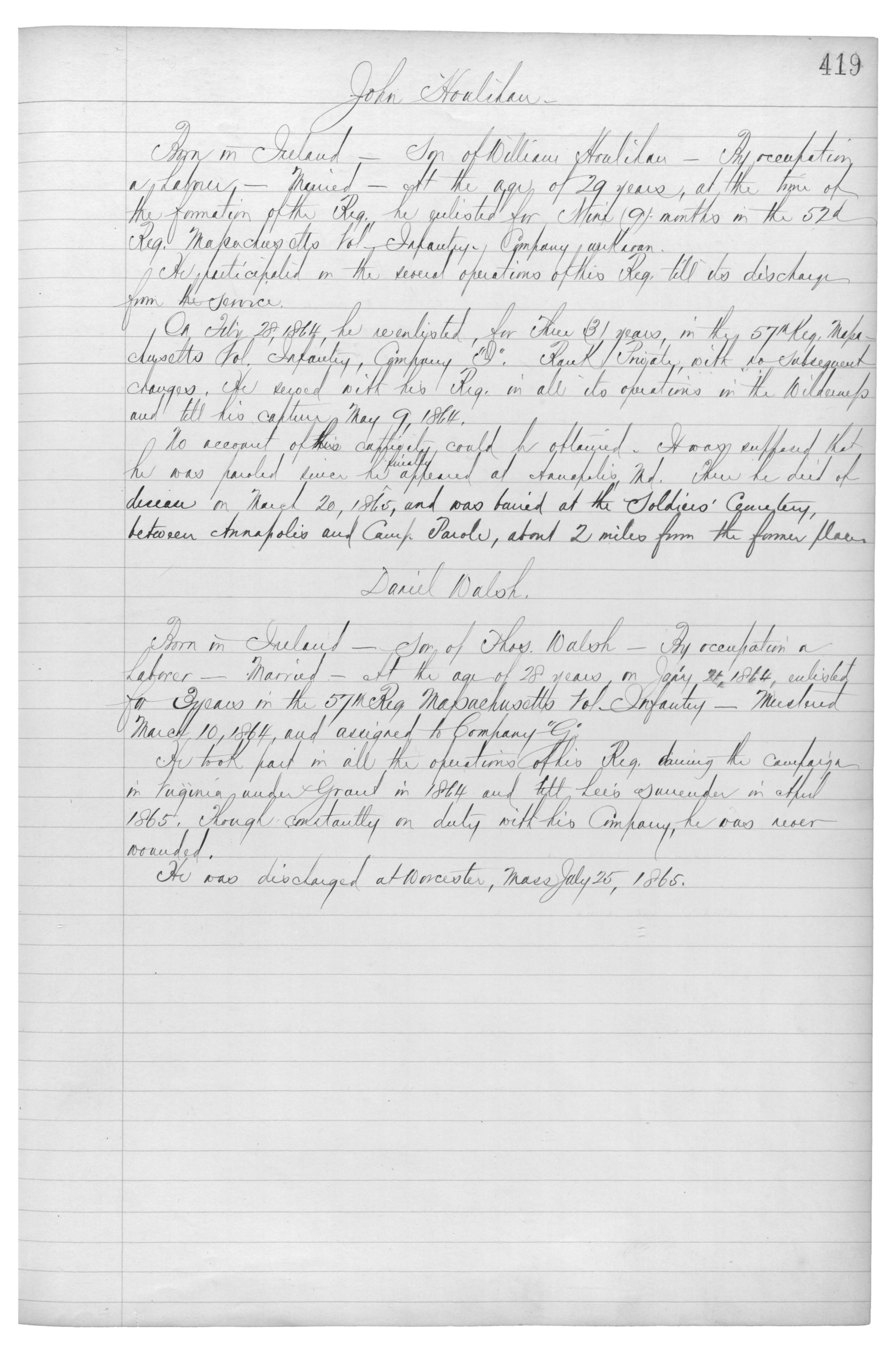 Born in Ireland_Son of {Thos.} Walsh_By occupation a Laborer_Married_At the age of 28 years, on Jan’y 21, 1864, enlisted for 3 years in the 57th Reg. Massachusetts Vol. Infantry_Mustered March 10, 1864, and assigned to Company “G”