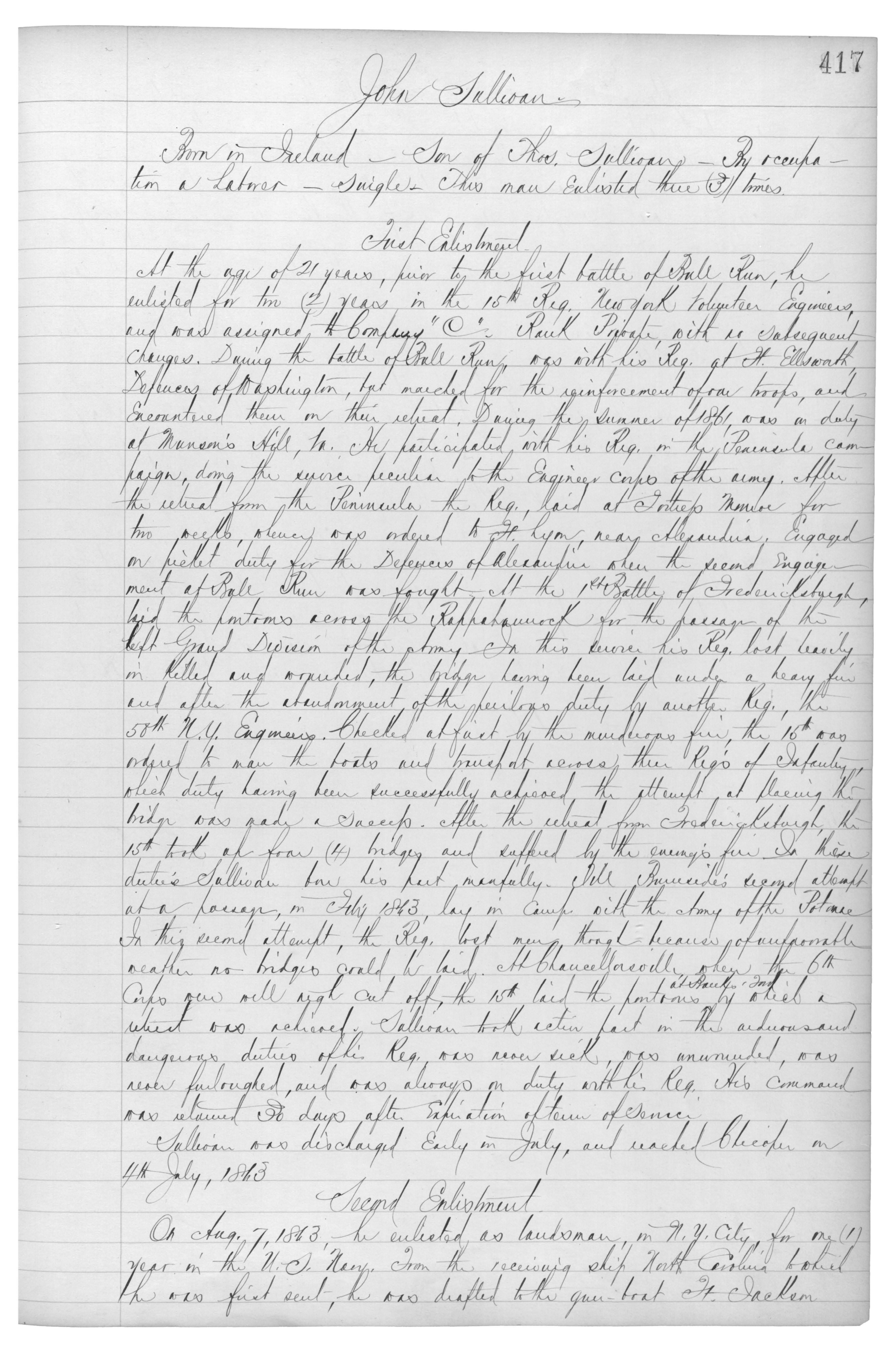 At the age of 21 years, prior to the first battle of Bull Run, he enlisted for two (2) years in the 15th Reg. New York Volunteer Engineers, and was assigned to Company “C”. Rank Private, with no subsequent changes. During the battle of Bull Run, was with his Reg. At Fr. Ellsworth Defences of Washington, but marched for the reinforcement of our troops, and encountered them on their retreat. During the summer of 1861, eas on duty at Monson’s Hill, Va. He participated with his Reg. in the Peninsula Campaign, doing the service peculiar to the engineer corps of the army. After the retreat from the Peninsula the Reg., laid at Fortress Monroe for two weeks, whence was ordered to Ft. Lyon, near Alexandria. Engaged on picket duty for the Defences of Alexandria when the second engagement at Bull Run was fought. At the 1st Battle of Fredericksburgh, laid the pontoons across the Rappahannock for the passage of the {Left} Grand Division of the Army. In this service his Reg. lost heavily in killed and wounded, the bridge having been laid under a heavy fire and after the abandonment of the perilous duty by another Reg., the 50th N.Y. Engineers. Checked at first by the murderous fire, the 16th was ordered to man the boats and {???} across the Regs of Infantry, which duty having been successfully achieved the attempt at fleeing the bridge was made a success. After the retreat from Fredericksburgh, the duties Sullivan {???} his part manfully. Till Burnsides second attempt at a passage, in Feb’y 1863, lay in camp with the Army of the Potomac. In the second attempt, the Reg. lost men though because of unfavorable weather as bridges could be laid. At Chancellorsville, when the 6th Corps were well nigh cut off, the 15th laid the pontoons at {???} by which a retreat was achieved. Sullivan took active part in the arduous and dangerous duties of his Reg. was never sick, was unwounded, was never furloughed, and was always on duty with his Reg. His command was relieved 30 days after expiration of term of service.
