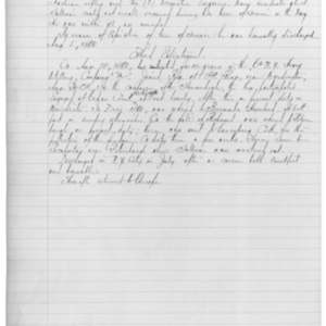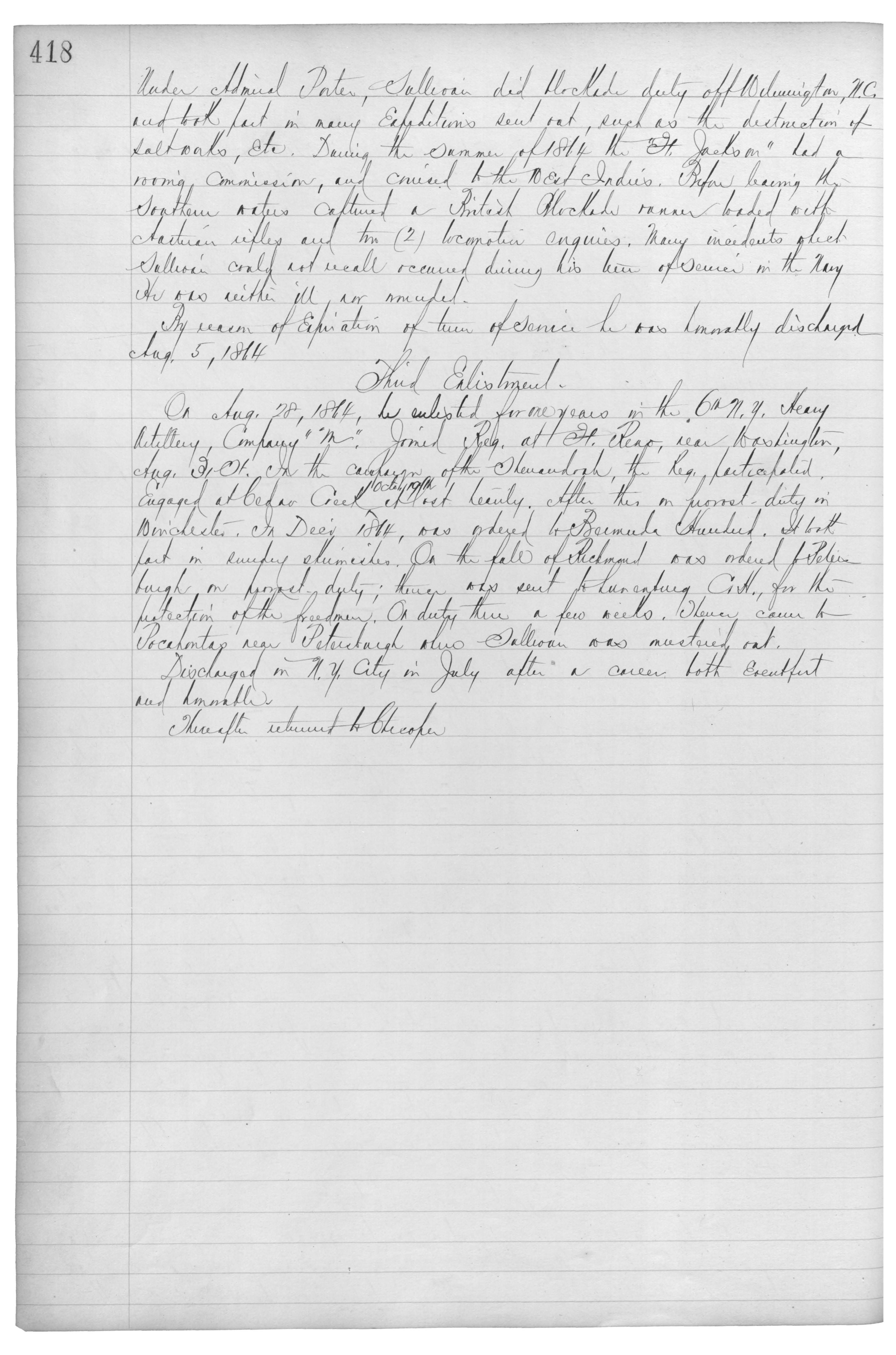 On Aug. 7, 1863, he enlisted as landsman, in N.Y. City, for one (1) year in the U.S. Navy. From the receiving ship North Carolina to which he was first sent, he was drafted to the gun-boat Ft. Jackson. Under Admiral Porter, Sullivan did blockade duty off {Wilmington}, N.C. and took part in many expeditions sent out, such as the destruction of {???}, etc. During the summer of 1864 the “Ft. Jackson” had a {rooming} Commission, and {carried} to the West Indies. Before learning the Southern waters captured a British blockade runner loaded with {???} rifles and two (2) locomotive engines. Many incidents which Sullivan could not recall occurred during his term of service in the Navy. He was neither ill nor wounded.