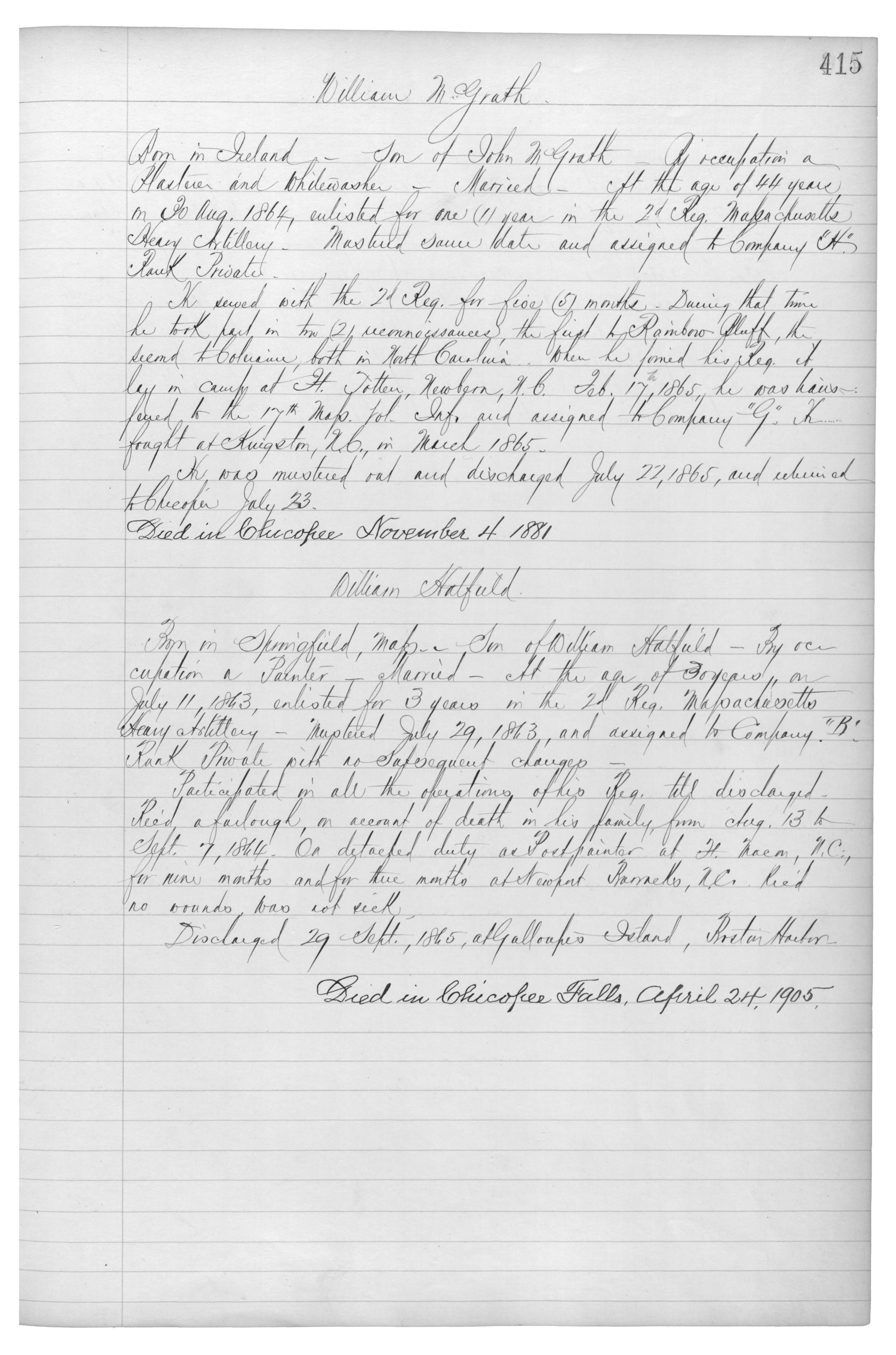 Born in Ireland_Son of John McGrath_By occupation a Plasterer and Whitewasher_Married_At the age of 44 years in 30 Aug. 1864, enlisted for one (1) year in the 2d Reg. Massachusetts Heavy Artillery. Mustered same date and assigned to Company “H”. Rank Private.