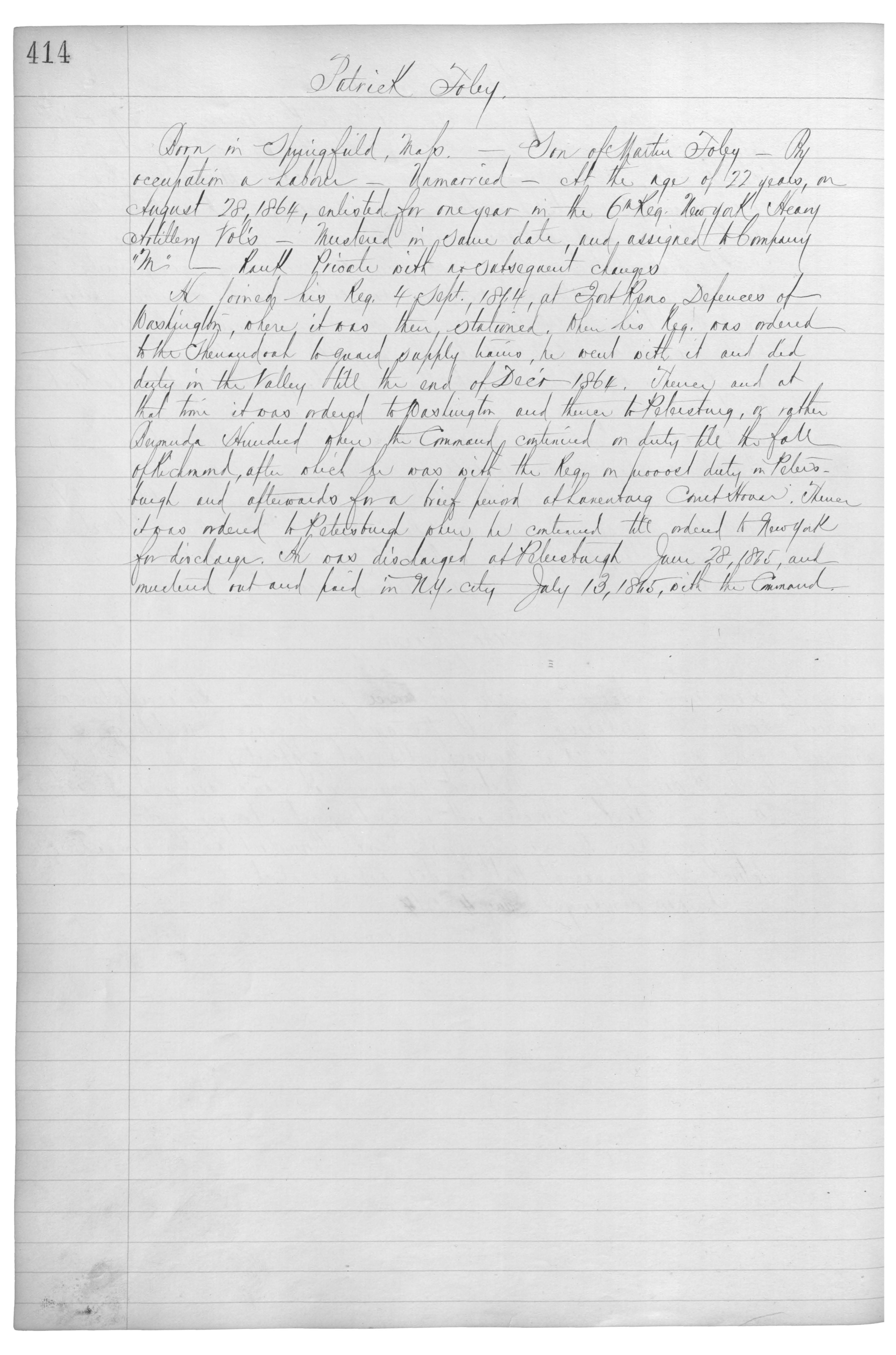Born in Springfield, Mass._Son of Martin Foley_By occupation a Laborer_Unmarried_At the age of 22 years, on August 28, 1864, enlisted for one year in the 6th Reg. New York Heavy Artillery Vol’s_Mustered in same date, and assigned to Company “M”_Rank Private with no subsequent changes.
