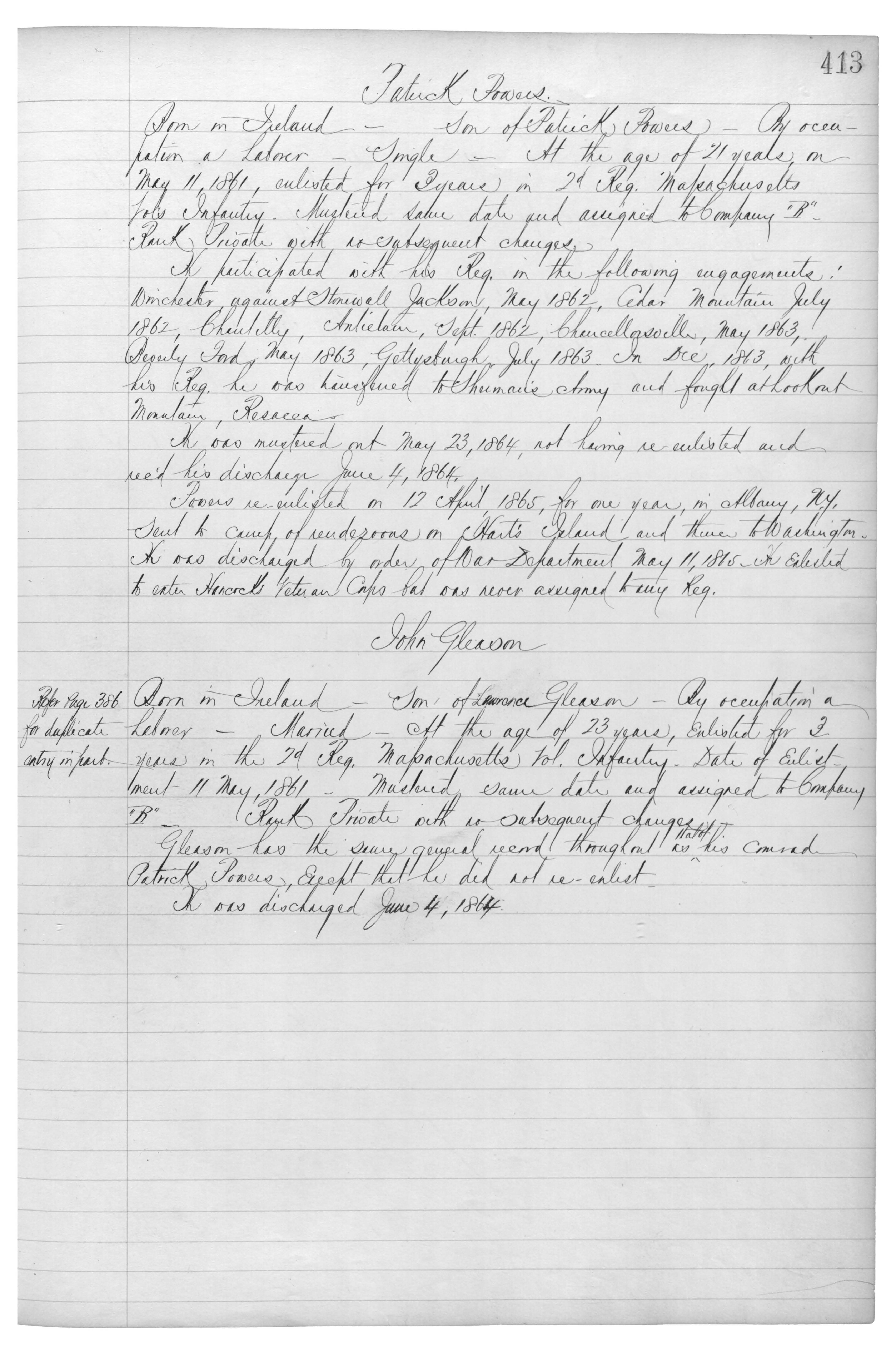 Gleason has the same general record throughout as that of his comrade Patrick Powers, except that he did not re-enlisted.