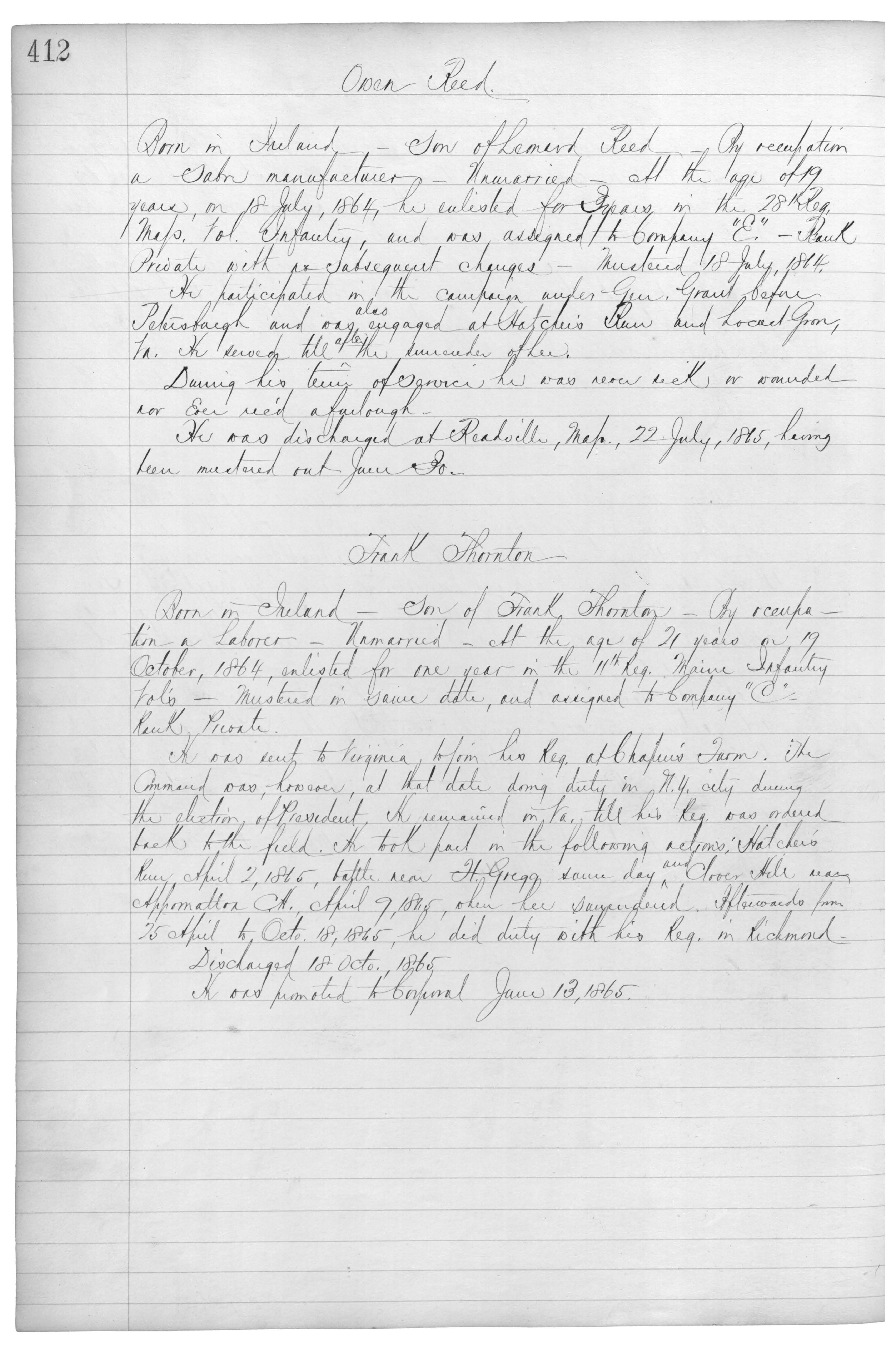 Born in Ireland_Son of Frank Thornton_By occupation a Laborer_Unmarried_At the age of 21 years on 19 October, 1864, enlisted for one year in the 11th Reg. Maine Infantry Vol’s_Mustered in same date, and assigned to company “C”_Rank Private.