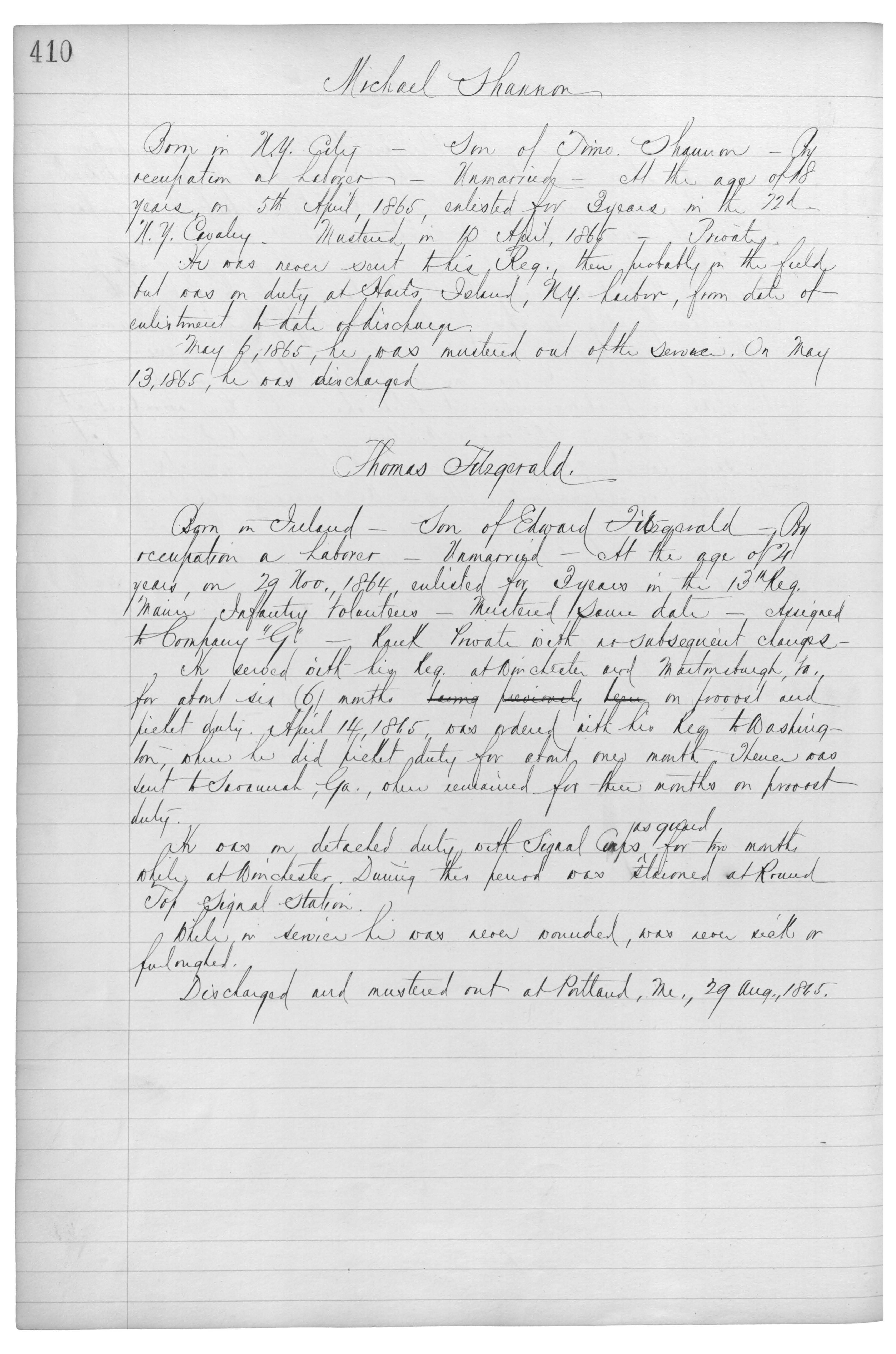 Born in N.Y. City_Son of {Timo.} Shannon_By occupation a Laborer_Unmarried_at the age of 18 years, on 5th April, 1865, enlisted for 3 years in the 22d N.Y. Cavalry_Mustered in 10 April, 1865_Private.