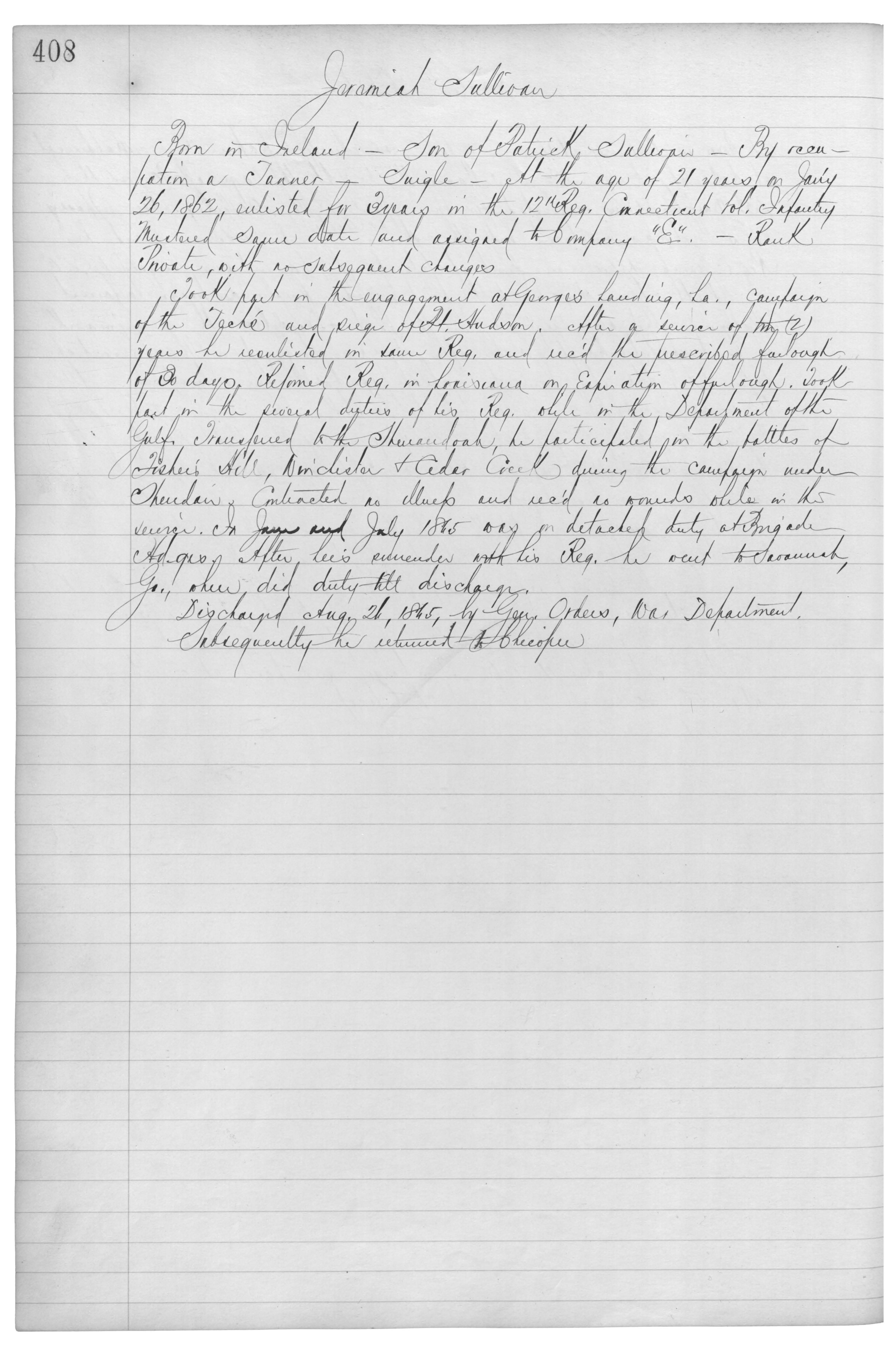 Born in Ireland_Son of Patrick Sullivan_By occupation a Tanner_Single_At the age of 21 years on Jan’y 26, 1862, enlisted for 3 years in the 12th Reg. Connecticut Vol. Infantry. Mustered same date and assigned to Company “E”._Rank Private, with no subsequent changes.