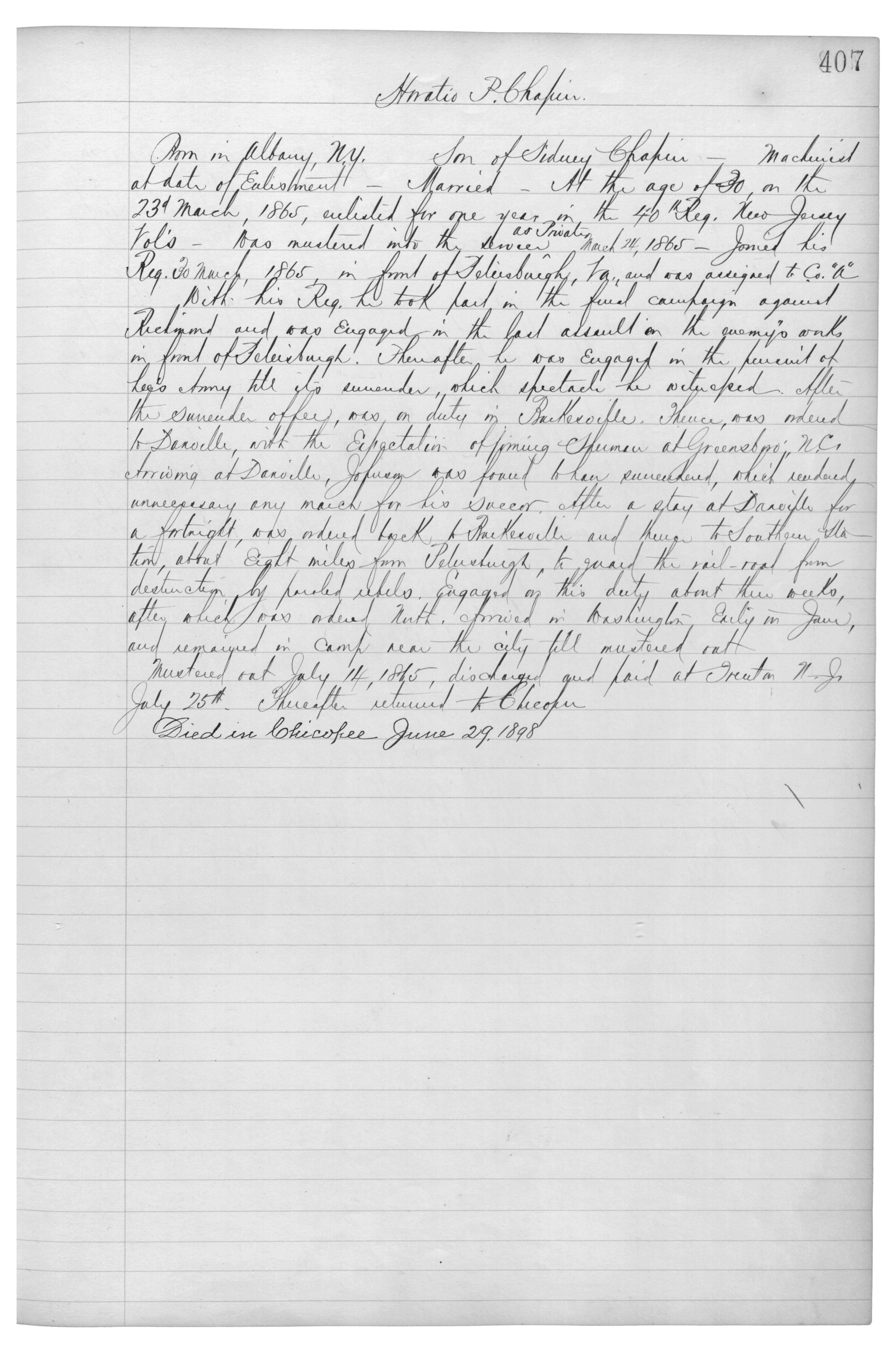 Born in Albany, N.Y._Son of Sidney Chapin_Machinist at date of enlistment_Married_At the age of 30, on the 23d March, 1865, enlisted for one year in the 40th Reg. New Jersey Vol’s_Was mustered into the service as Private March 24, 1865_Joined his Reg. 30 March, 1865, in front of Petersburgh, Va. And was assigned to Co. “A”