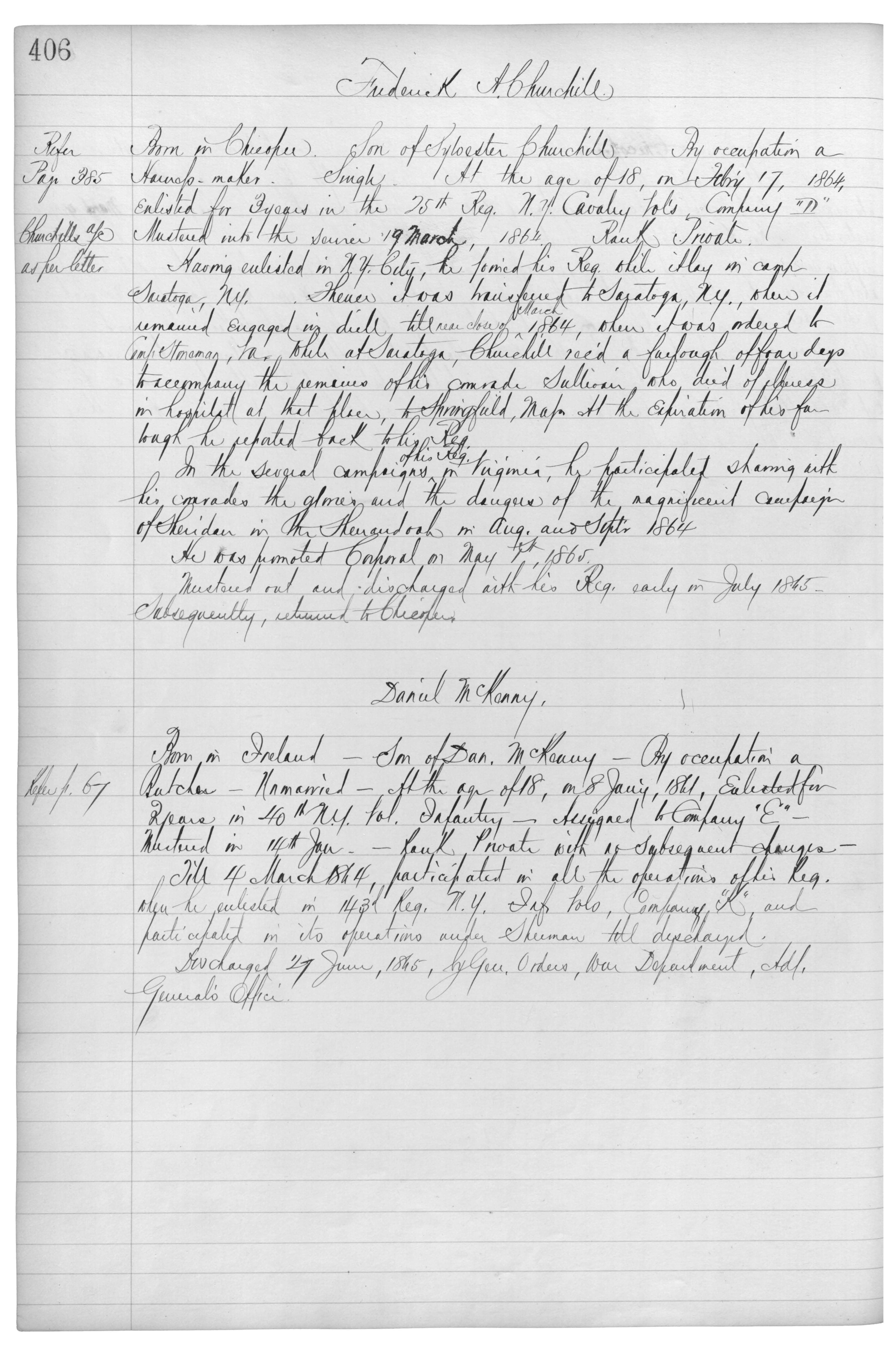 Born in Chicopee. Son of Sylvester Churchill. By occupation a Harness-maker. Single. At the age of 18, on Febr’y 17, 1864, enlisted for 3 years in the 25th Reg. N.Y. Cavalry Vol’s, Company “D”. Mustered into the service 19 March, 1864. Rank Private.