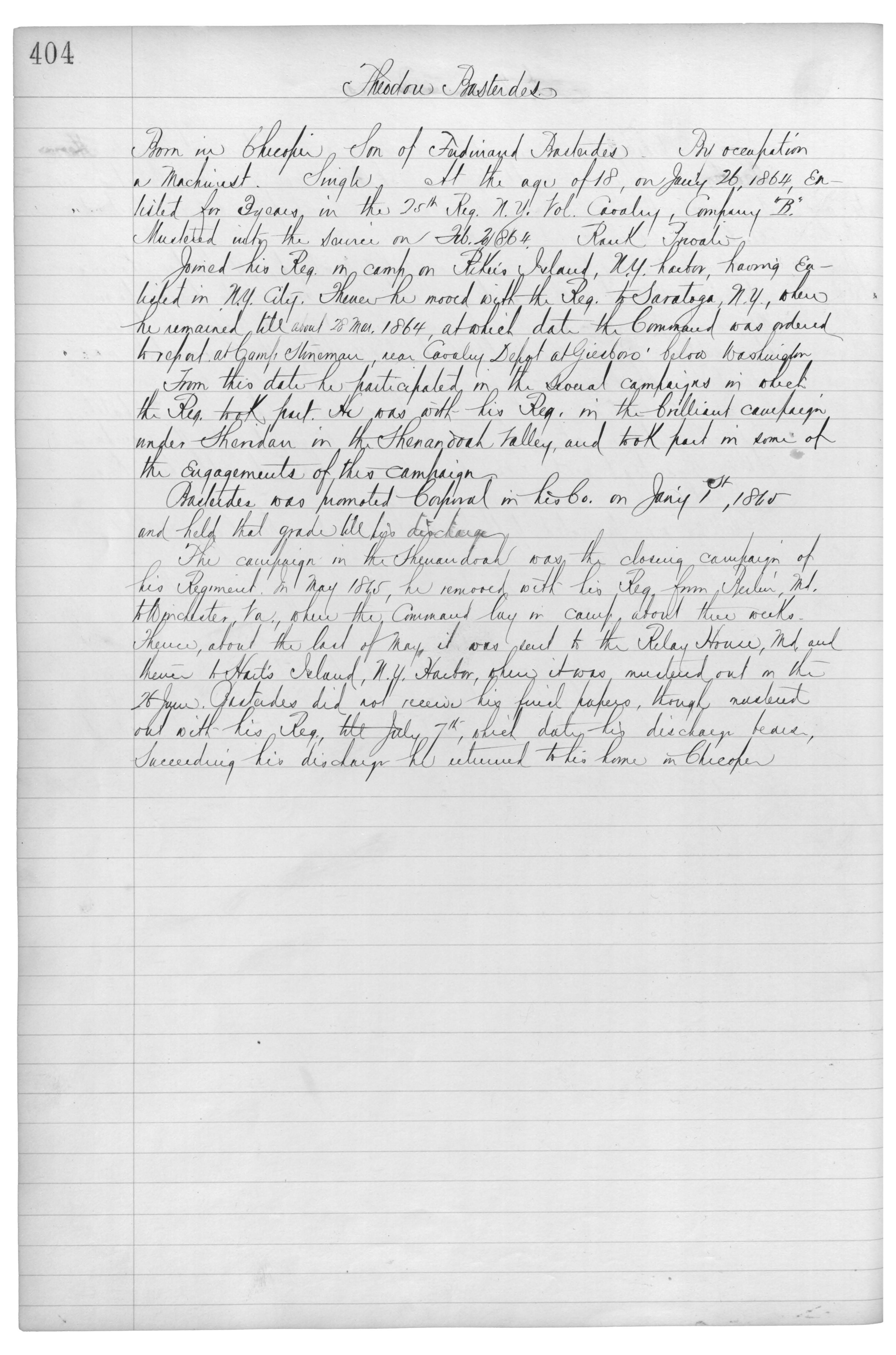 Born in Chicopee. Son of Ferdinand Basterdus. By occupation a Machinist. Single. At the age of 18, on Jan’y 26, 1864, enlisted for 3 years in the 25th Reg. N.Y. Vols. Cavalry, Company “B”.