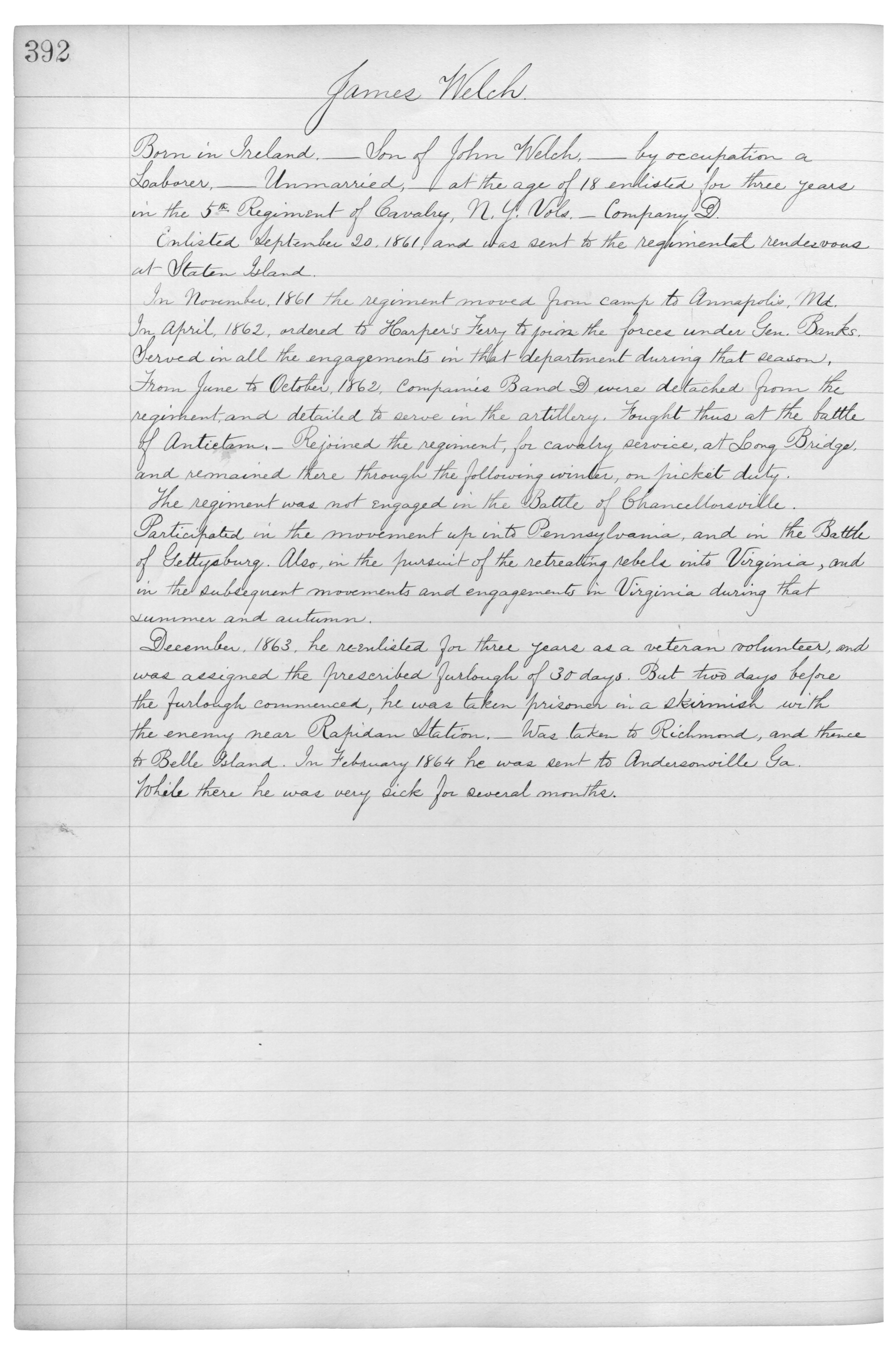 Born in Ireland,_Son of John Welch,_by occupation a Laborer,_Unmarried,_at the age of 18 enlisted for three years in the 5th Regiment of Cavalry, N.Y. Vols._Company D.