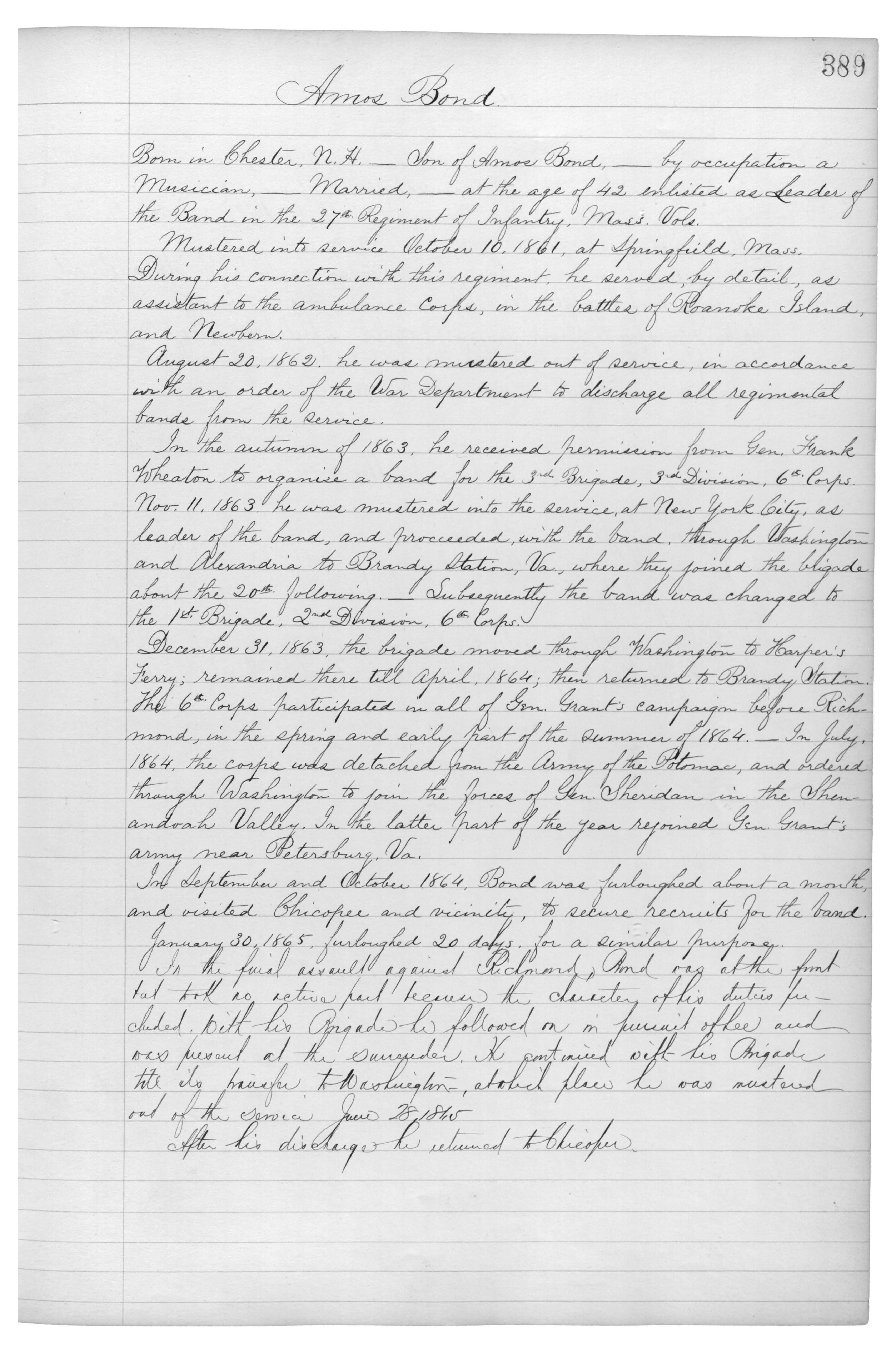 Born in Chester, N.H._Son of Amos Bond,_by occupation a Musician,_Married,_at the age of 42 enlisted as Leader of the Bank in the 27th Regiment of Infantry, Mass. Vols.