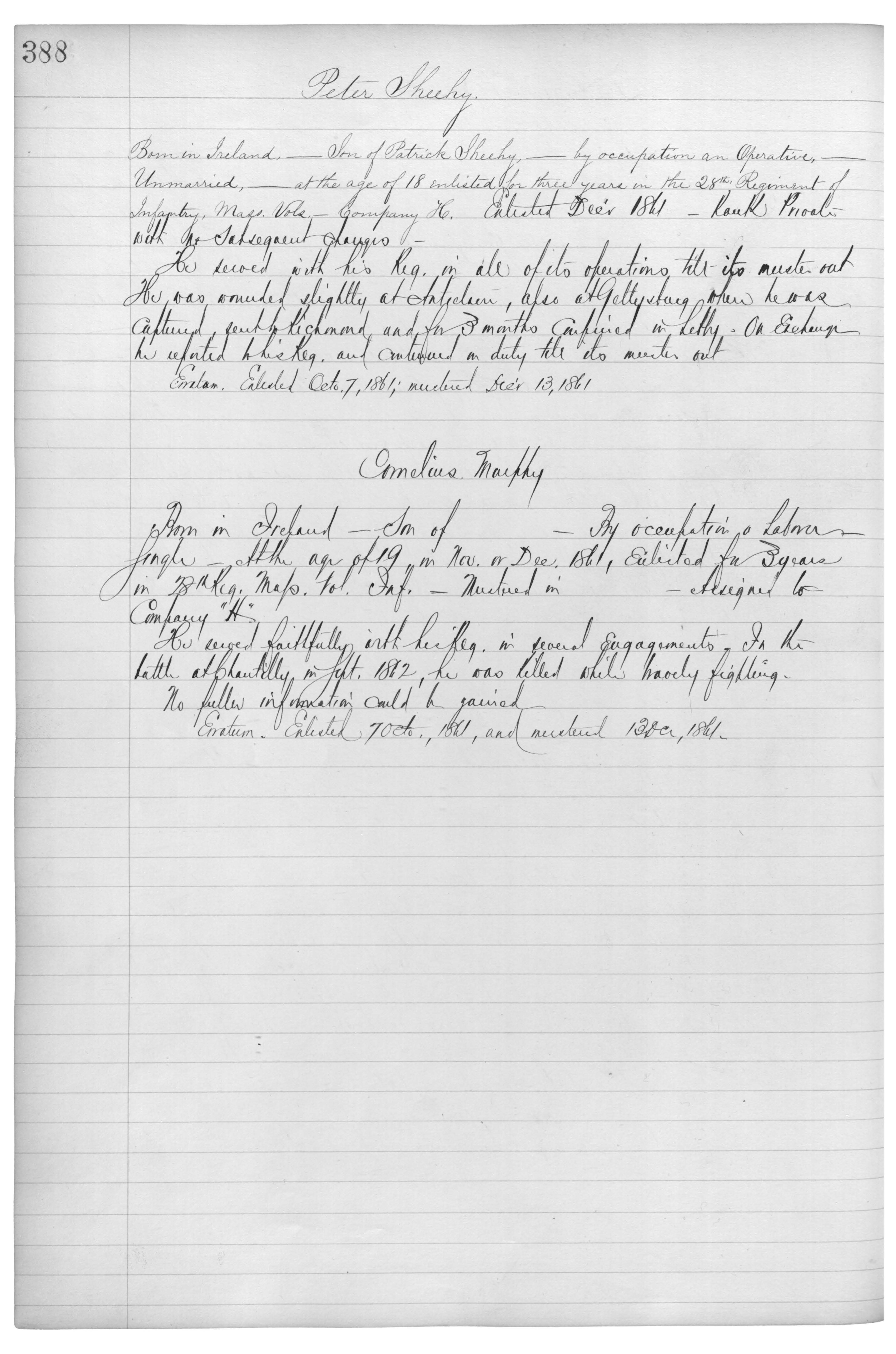 Born in Ireland,_Son of Patrick Sheehy,_by occupation an Operative,_Unmarried,_at the age of 18 enlisted for three years in the 28th Regiment of Infantry, Mass. Vols._Company H. Enlisted Dec’r 1861_Rank Private with no subsequent changes_