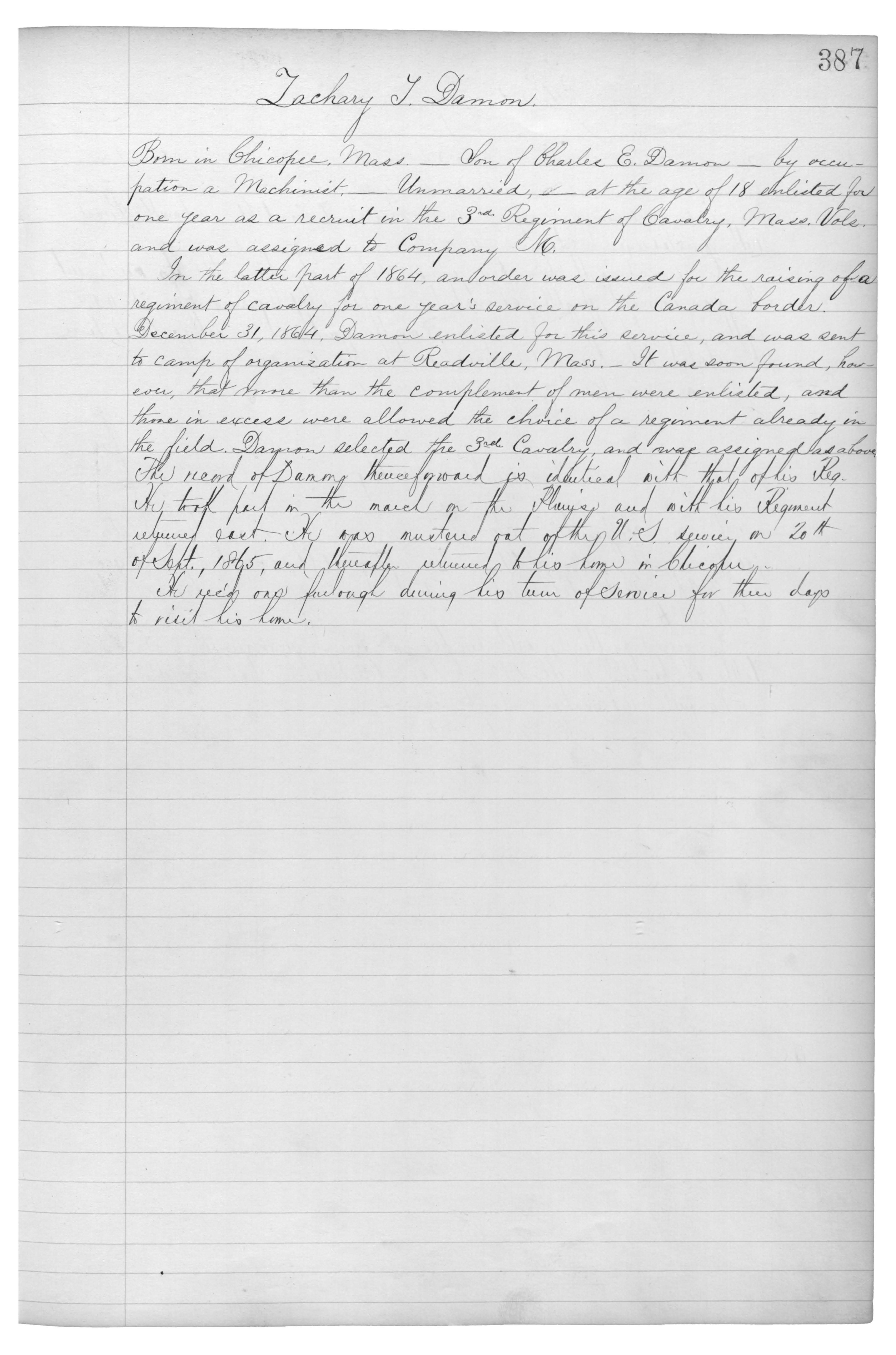 In the latter part of 1864, an order was issued for the raising of a regiment of cavalry for one year’s service on the Canada border. December 31, 1864, Damon enlisted for this service, and was sent to camp of organization at Readville, Mass._It was soon found, however, that more than the complement of men were enlisted, and those in excess were allowed the choice of a regiment already in the field. Damon selected the 3rd Cavalry, and was assigned as above. The record of Damon thence forward is identical with that of this Reg. He took aprt in the march on the {???} and with his Regiment returned east. He was mustered out of the U.S. service on 20th of Sept., 1865, and thereafter returned to his home in Chicopee.