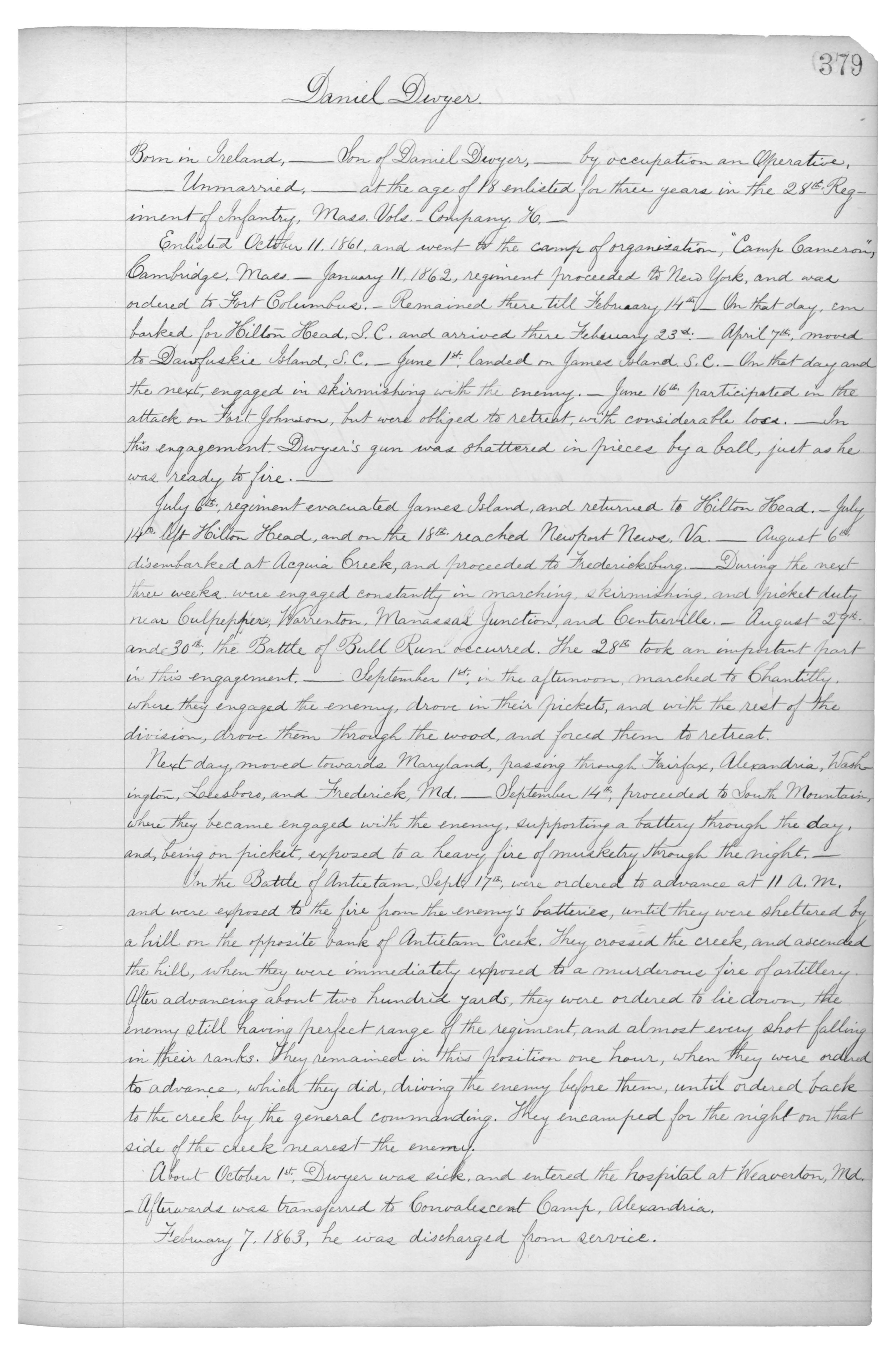 Born in Ireland,_Son of Daniel Dwyer,_by occupation an Operative,_Unmarried,_at the age of 18 enlisted for three years in the 28th Regiment of Infantry, Mass. Vols._Company H._
