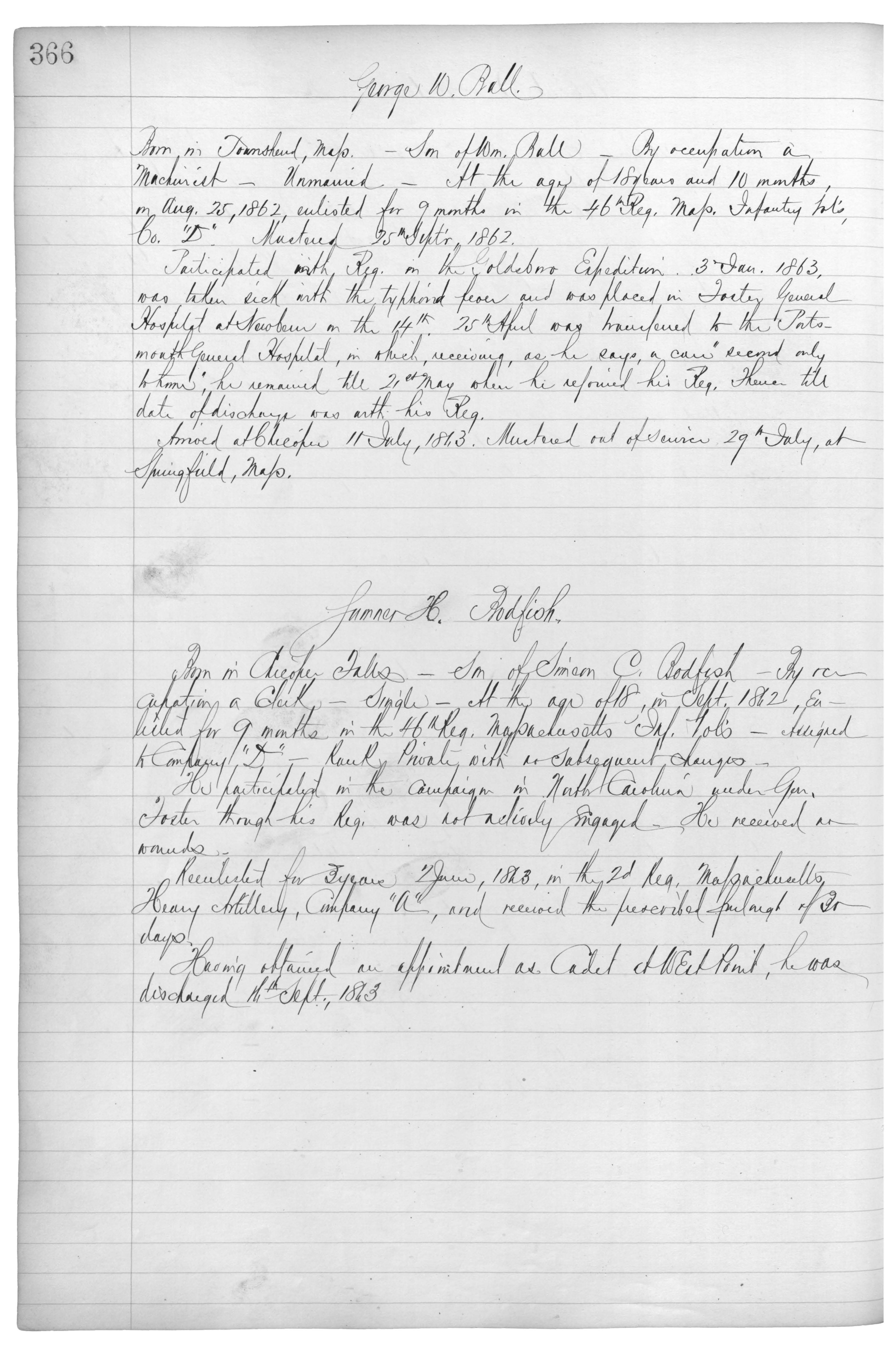 Born in Chicopee Falls_Son of Simeon C. Bodfish_By occupation a Clerk_Single_At the age of 18, in Sept. 1862, enlisted for 9 months in the 46th Reg. Massachusetts Inf. Vol’s_Assigned to Company “D”_Rank Private with no subsequent changes.