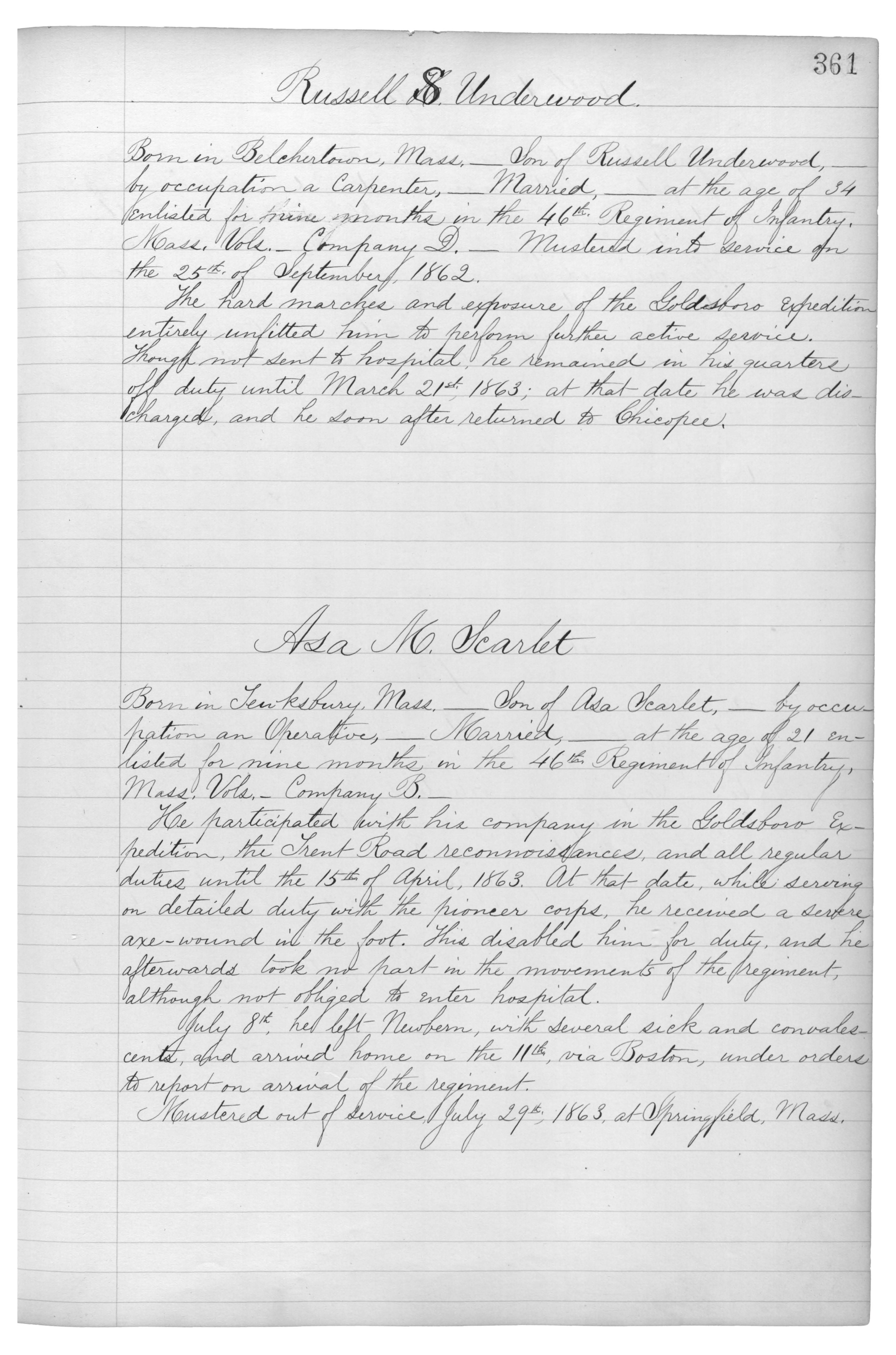 Born in Tewksbury, Mass._Son of Asa Scarlet,_by occupation an Operative,_Married,_at the age of 21 enlisted for nine months in the 46th Regiment of Infantry, Mass. Vols._Company B._