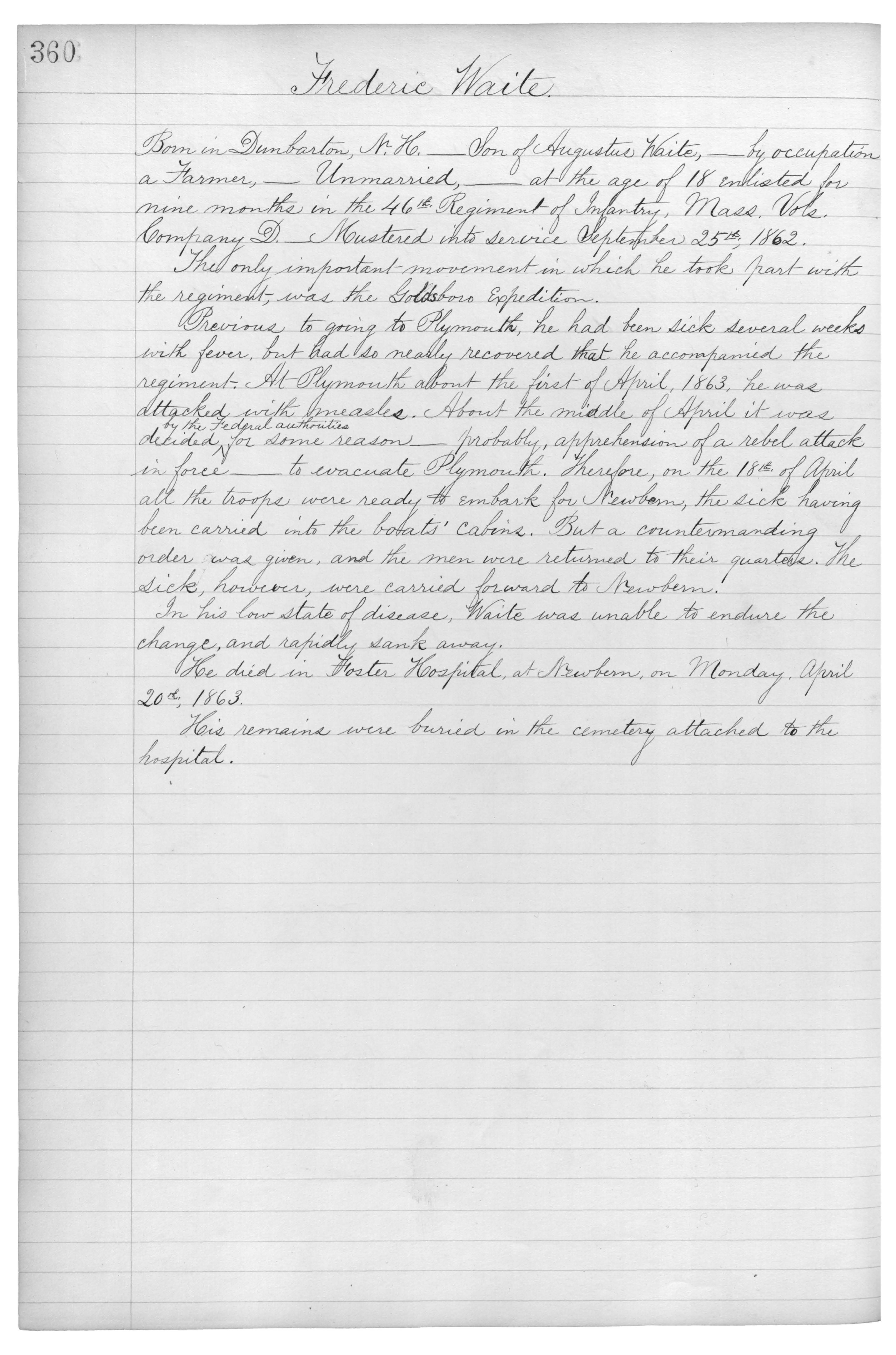 Born in Dunbarton, N.H._Son of Augustus White,_by occupation a Farmer,_Unmarried,_at the age of 18 enlisted for nine months in the 46th Regiment of Infantry, Mass. Vols. Company D._Mustered into service September 25th, 1862.