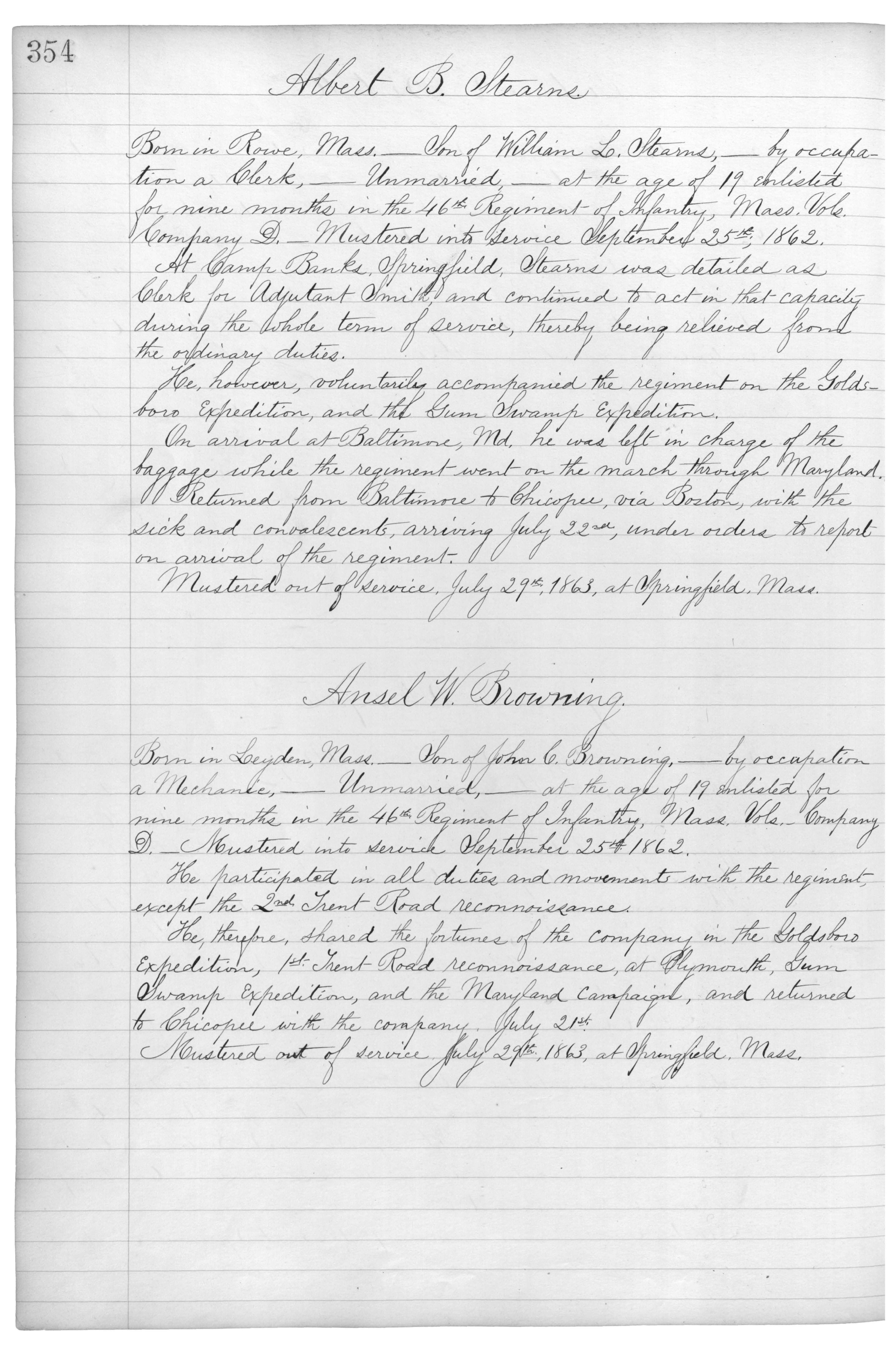 At Camp Banks, Springfield, Stearns was detailed as Clerk for Adjutant Smith, and continued to act in that capacity during the whole term of service, thereby being relieved from the ordinary duties.