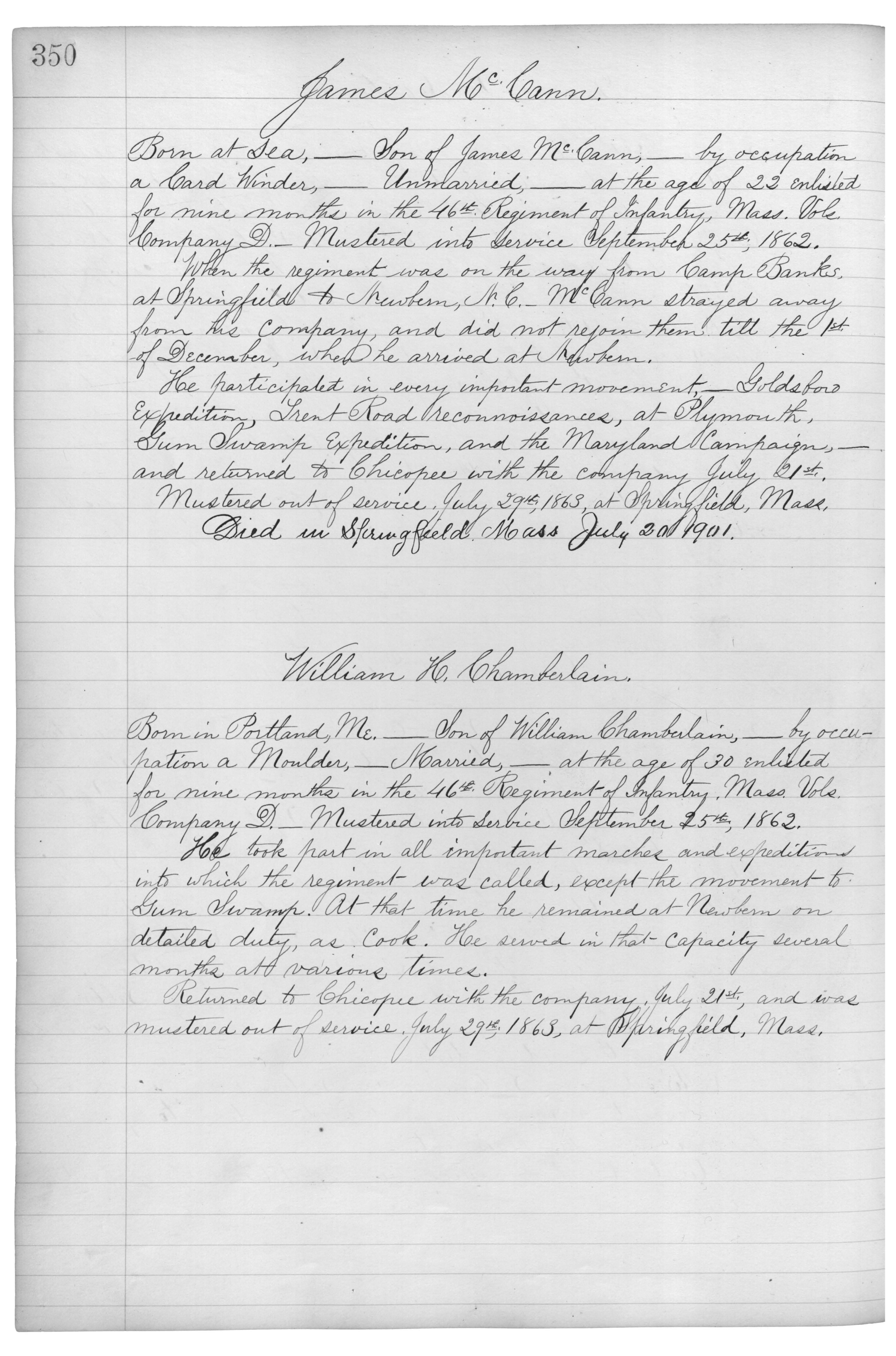 Born at Sea,_Son of James McCann,_by occupation a Card Winder,_Unmarried,_at the age of 22 enlisted for nine months in the 46th Regiment of Infantry, Mass. Vols. Company D._Mustered into service September 25th, 1862.