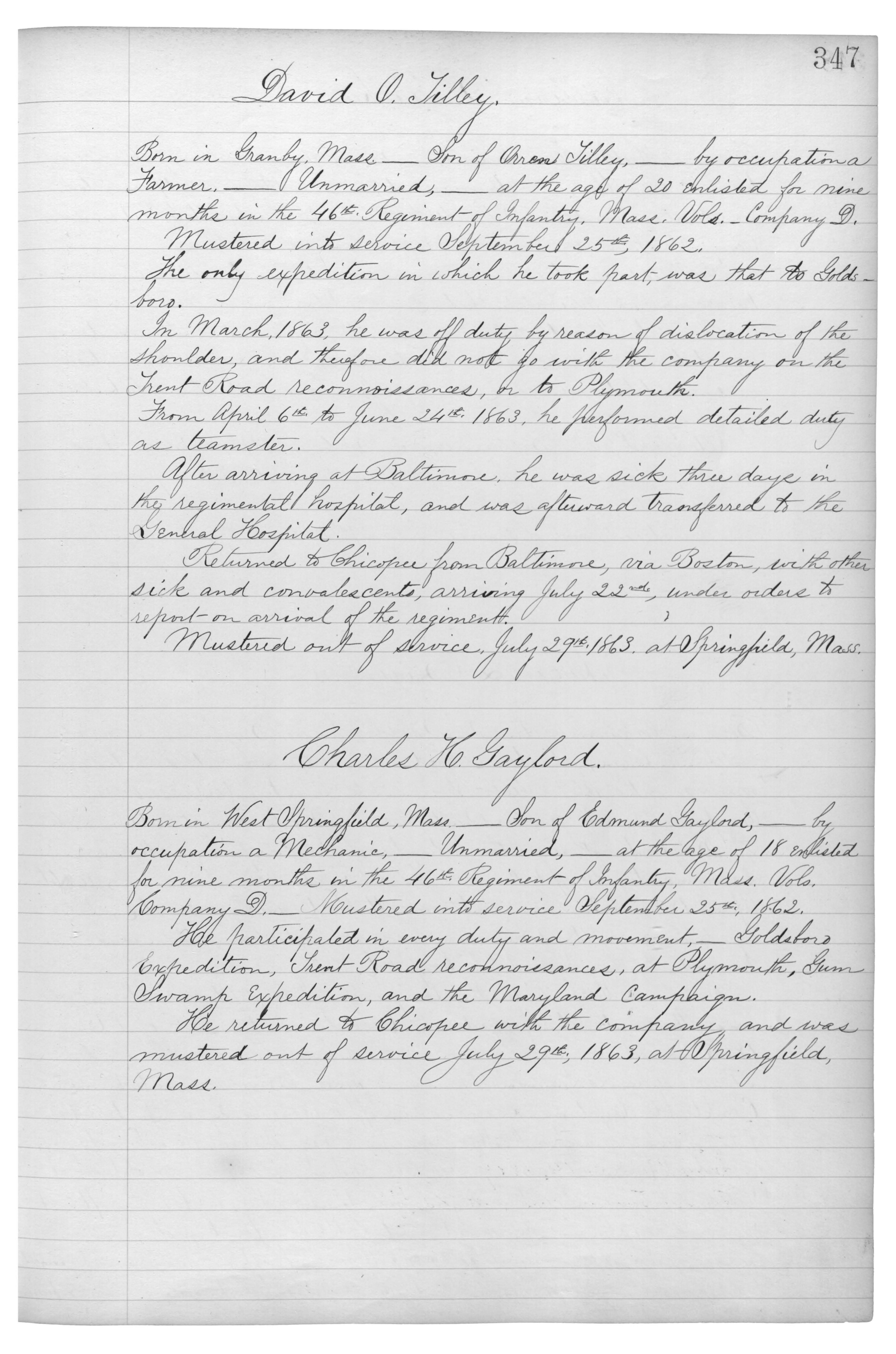 Born in Granby, Mass._Son of {Orress} Tilley,_by occupation a Farmer,_Unmarried,_at the age of 20 enlisted for nine months in the 46th Regiment of Infantry, Mass. Vols._Company D.