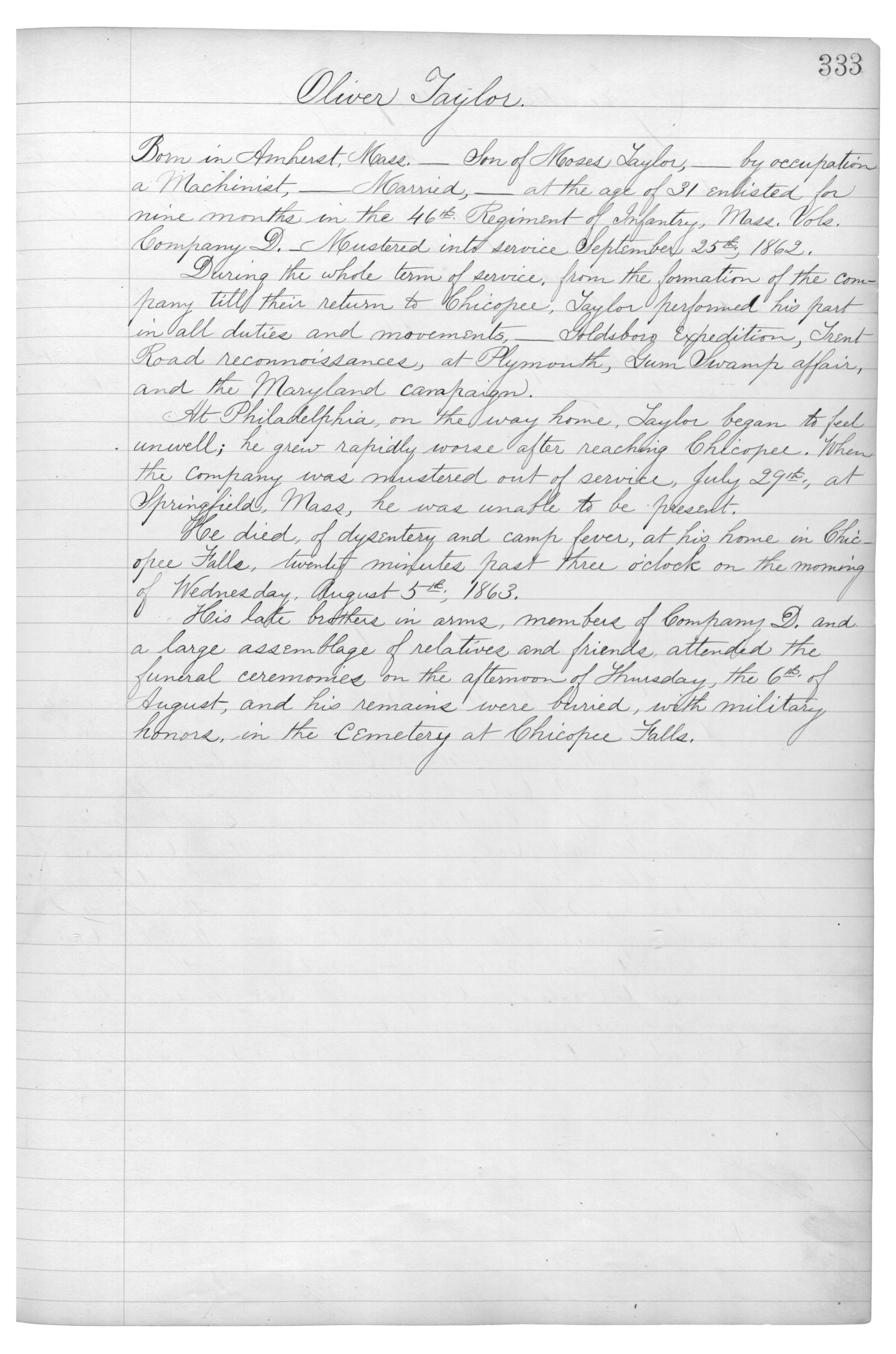 “Oliver Taylor, Civil War Soldier,” Chicopee Archives Online, accessed March 5, 2026, https://www.chicopeepubliclibrary.org/archives/items/show/2569.