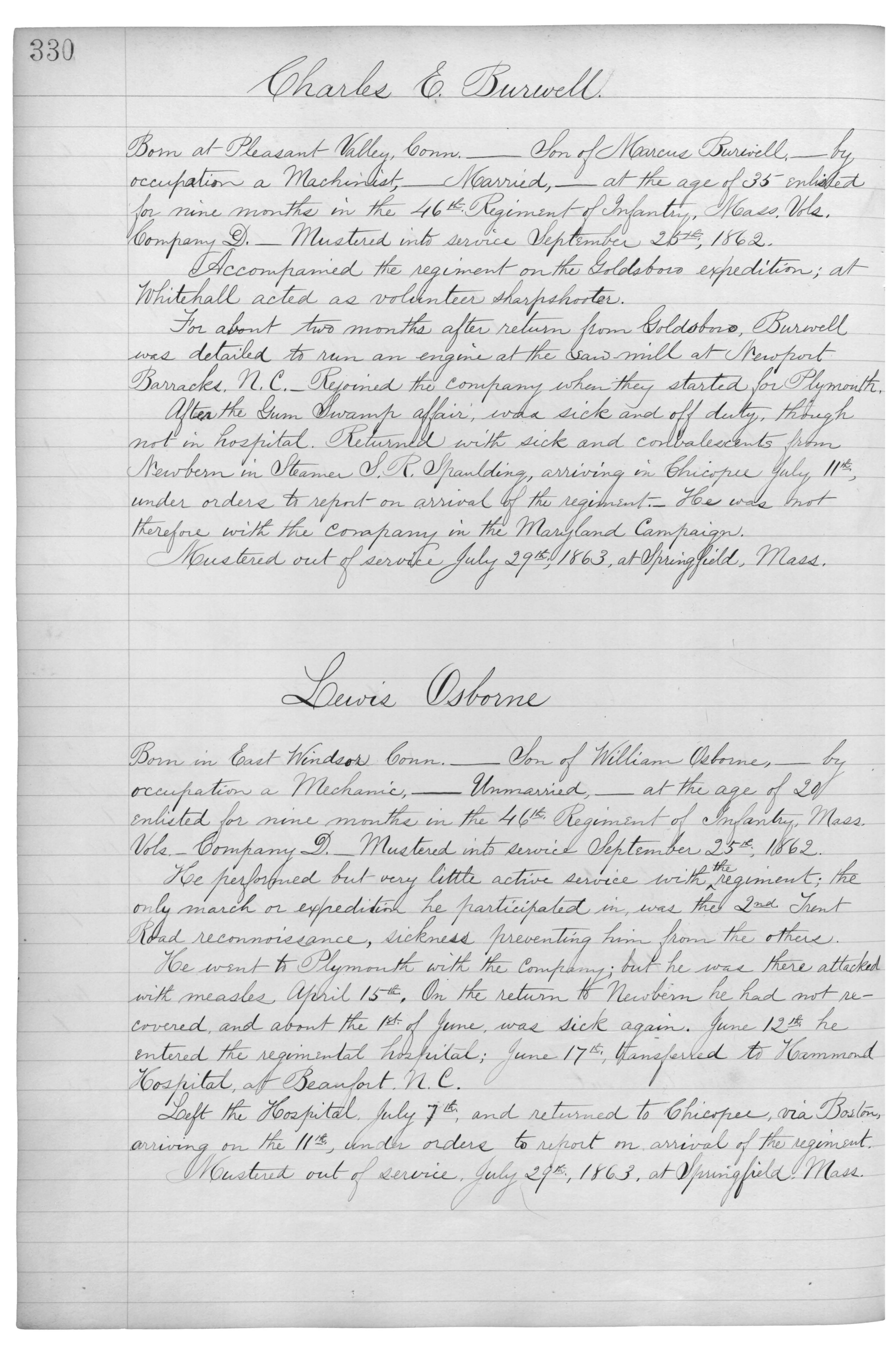 Bornn in East Windsor Conn._Son of William Osborne,_by occupation a Mechanic,_Unmarried,_at the age of 20 enlisted for nine months in the 46th Regiment of Infantry, Mass. Vols._Company D._Mustered into service September 25th, 1862.