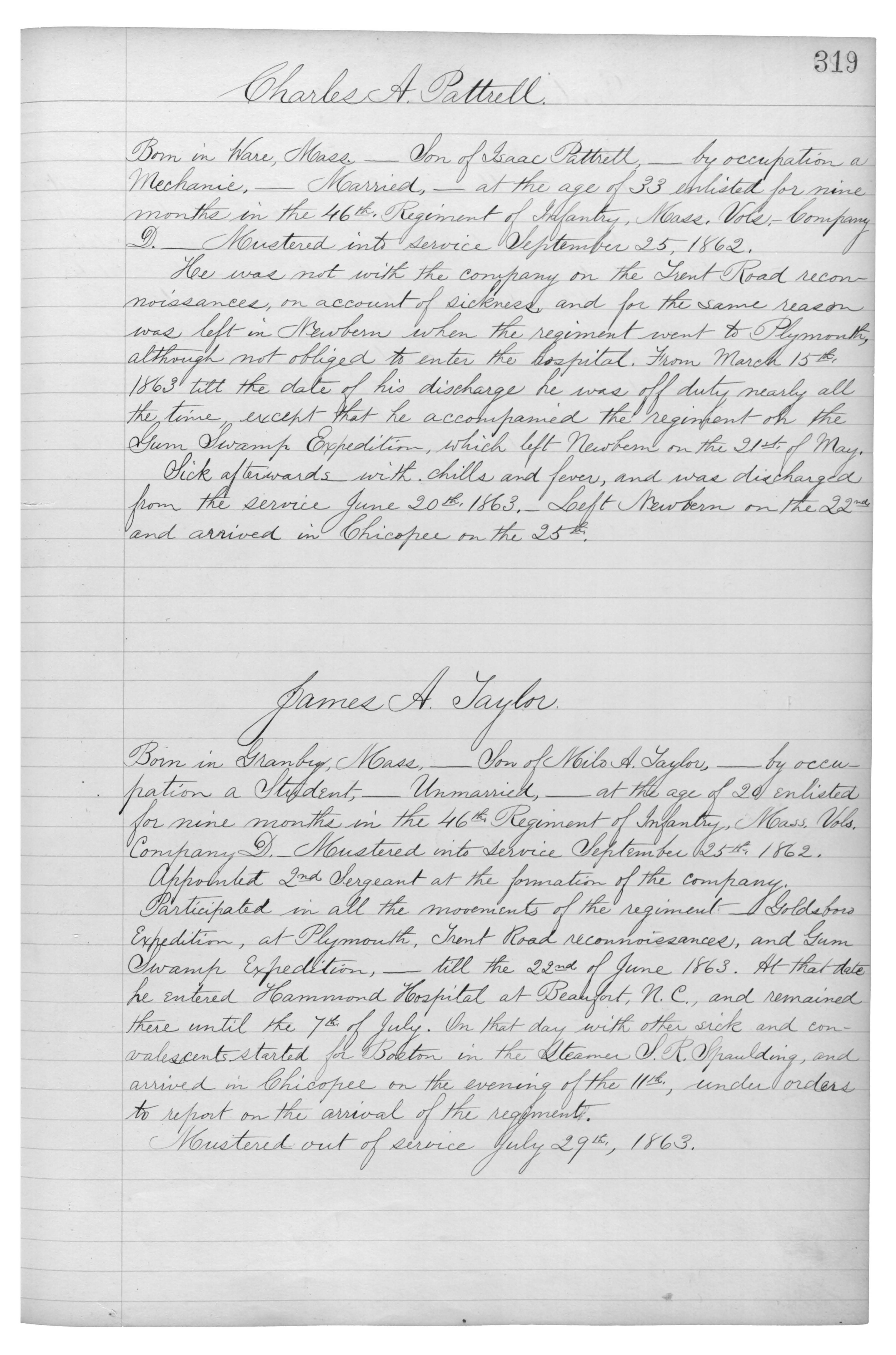 Sick afterwards_with chills and fever, and was discharged from the service June 20th 1863._Left Newbern on the 22nd and arrived in Chicopee on the 25th.